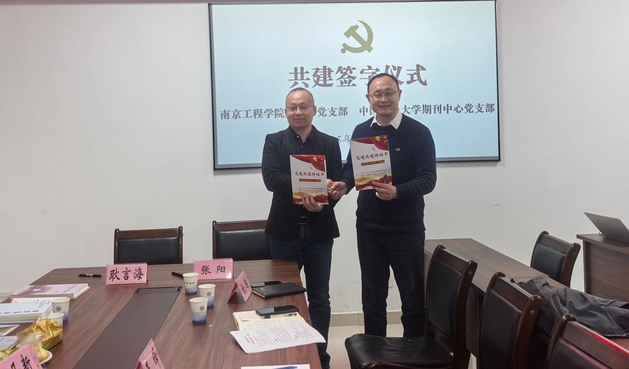 交流会上,期刊中心副主任、《中国矿业大学学报(社科版)》主编王锋介绍了期刊中心的发展历程和建设现状,期刊中心党支部副书记、《煤炭高等教育》编辑部主任张阳介绍了支部党建与业务深度融合,以及策划特色专栏专题推动社科研究与国家重大需求同频共振的经验做法。编辑老师各自分享了审稿流程、稿件来源、编校策划、个人成长等方面的具体经验。学报编辑部主任、党支部书记耿言海介绍了南京工程学院的办学历程、学报编辑部两刊的发展现状和办刊定位,并就“如何立足学校学科优势”“地方高校学报如何突出特色”“青年编辑能力提升路径”等问题展开热烈讨论。会上,双方签订了党建共建协议书,通过组织互建、党员互动、活动互联、优势互补、业务互动等方式,推动党建与事业发展“一融双高”。