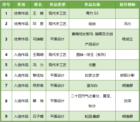 近日,我校艺术与设计学院王萌、王璐娴、冯力等3位教师,邓恩、马瑞敏、黎佳怡、邢苏缘、蔡培、石子媛等6位学生作品亮相“融通并茂”第五届江苏省高校设计作品展,其中,3件作品被评为优秀作品,学校荣获优秀组织奖。