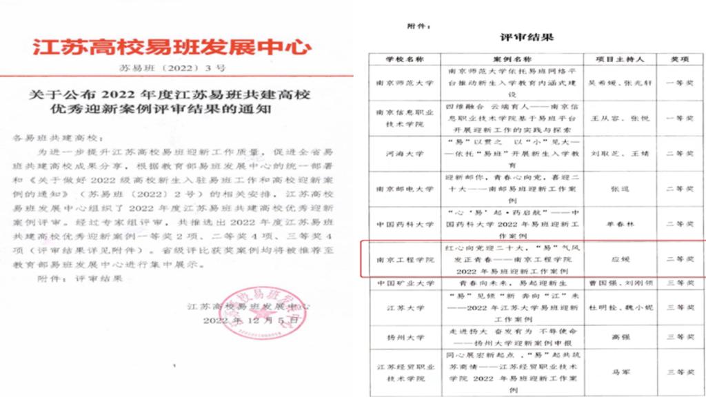 近日,江苏高校易班发展中心公布2022年度江苏易班共建高校优秀迎新案例评审结果,经专家组评审,共推选出一等奖2项、二等奖4项、三等奖4项,我校易班报送的工作案例荣获二等奖。