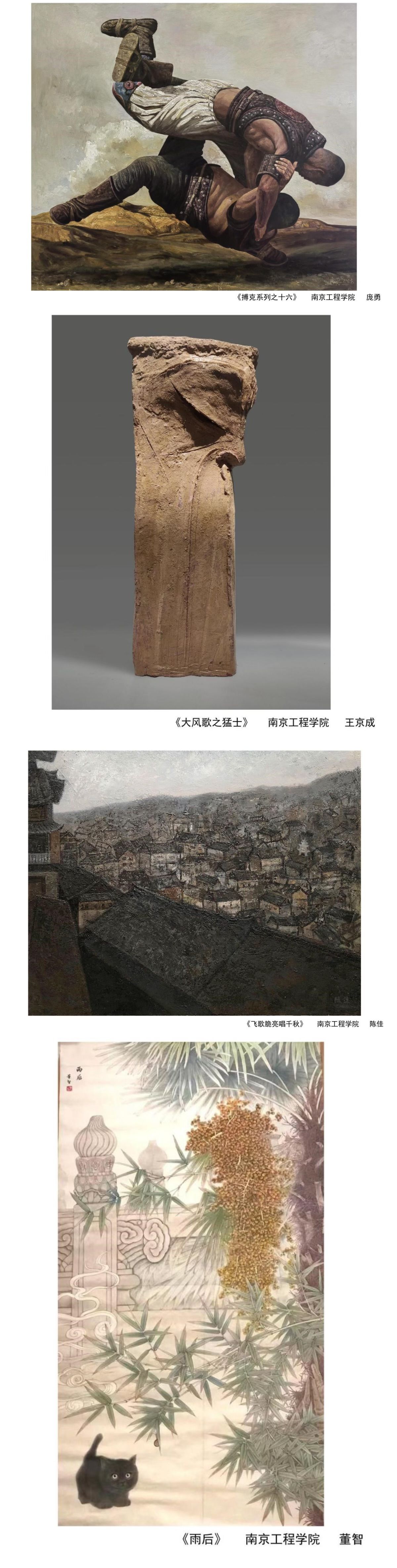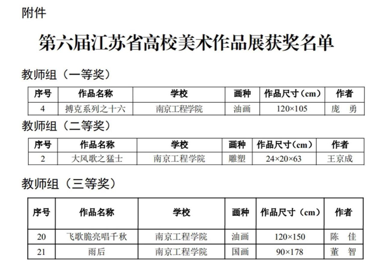 近日,江苏省教育厅公布“时代风华——第六届江苏省高校美术作品展”获奖名单,我校艺术与设计学院庞勇老师的作品《搏克系列之十六》荣获教师组一等奖;王京成老师的作品《大风歌之猛士》荣获二等奖;陈佳老师的作品《飞歌脆亮唱千秋》以及建筑工程学院董智老师的作品《雨后》获三等奖。我校荣获“优秀组织奖”。