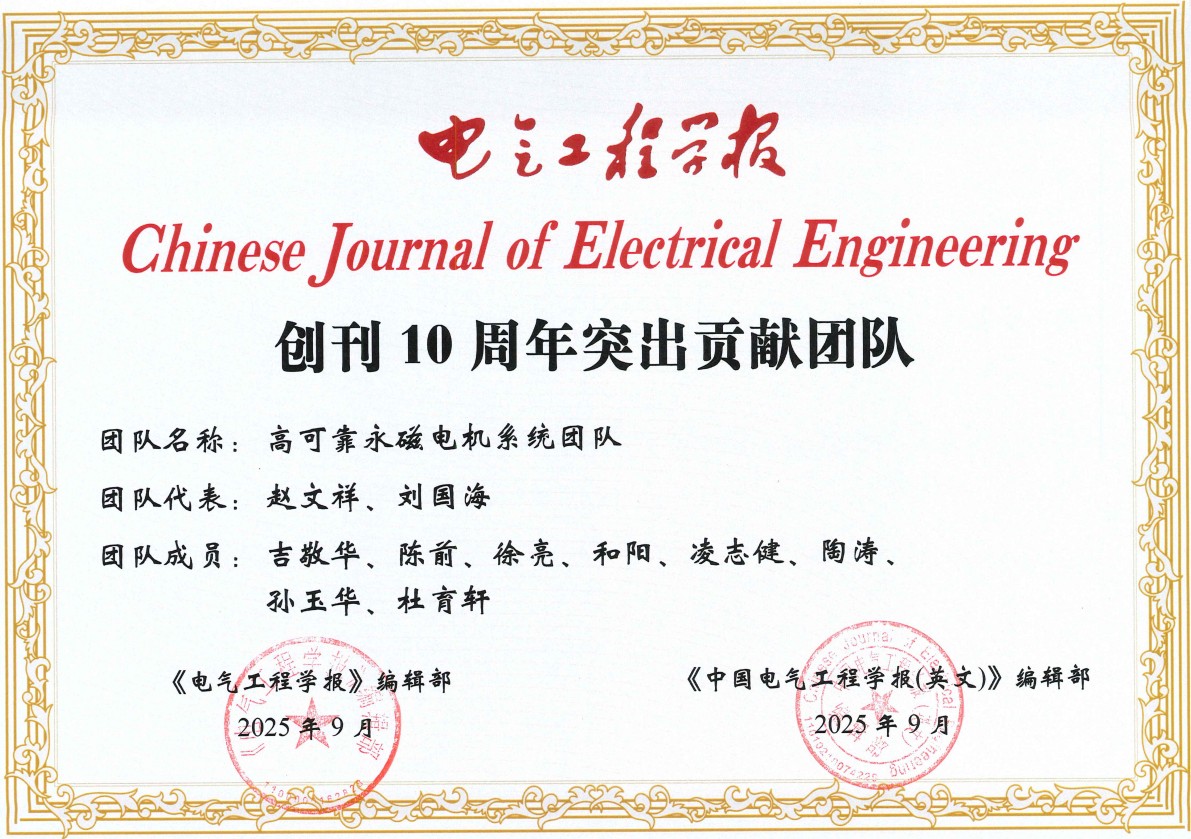 近日,由《电气工程学报》编辑部和《中国电气工程学报(英文)》(CJEE)编辑部主办,我校及上海交通大学、天津大学等高校协办的E-Forward·首届电气工程交叉前沿技术论坛在湖南长沙顺利召开。我校赵文祥教授领衔的高可靠永磁电机系统团队荣获《电气工程学报》、CJEE创刊10周年“突出贡献团队”奖 。