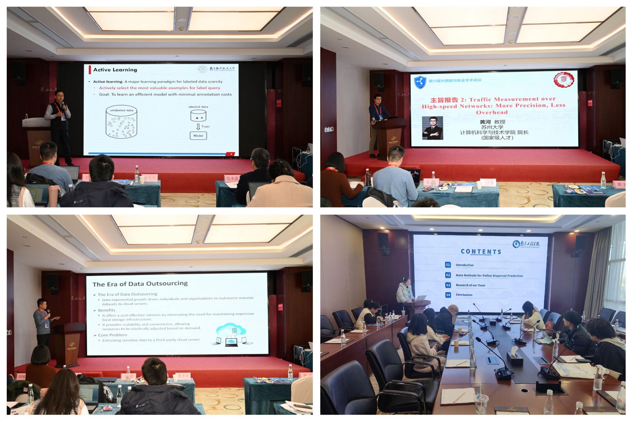 在主旨报告环节,南京航空航天大学黄圣君教授、苏州大学黄河教授、北京理工大学左聪教授分别围绕“面向多目标模型的主动学习”“高速网络流量测量:精度与开销的平衡”“支持联合查询的动态可搜索加密研究”等主题作了精彩分享,并与参会者进行深入交流。