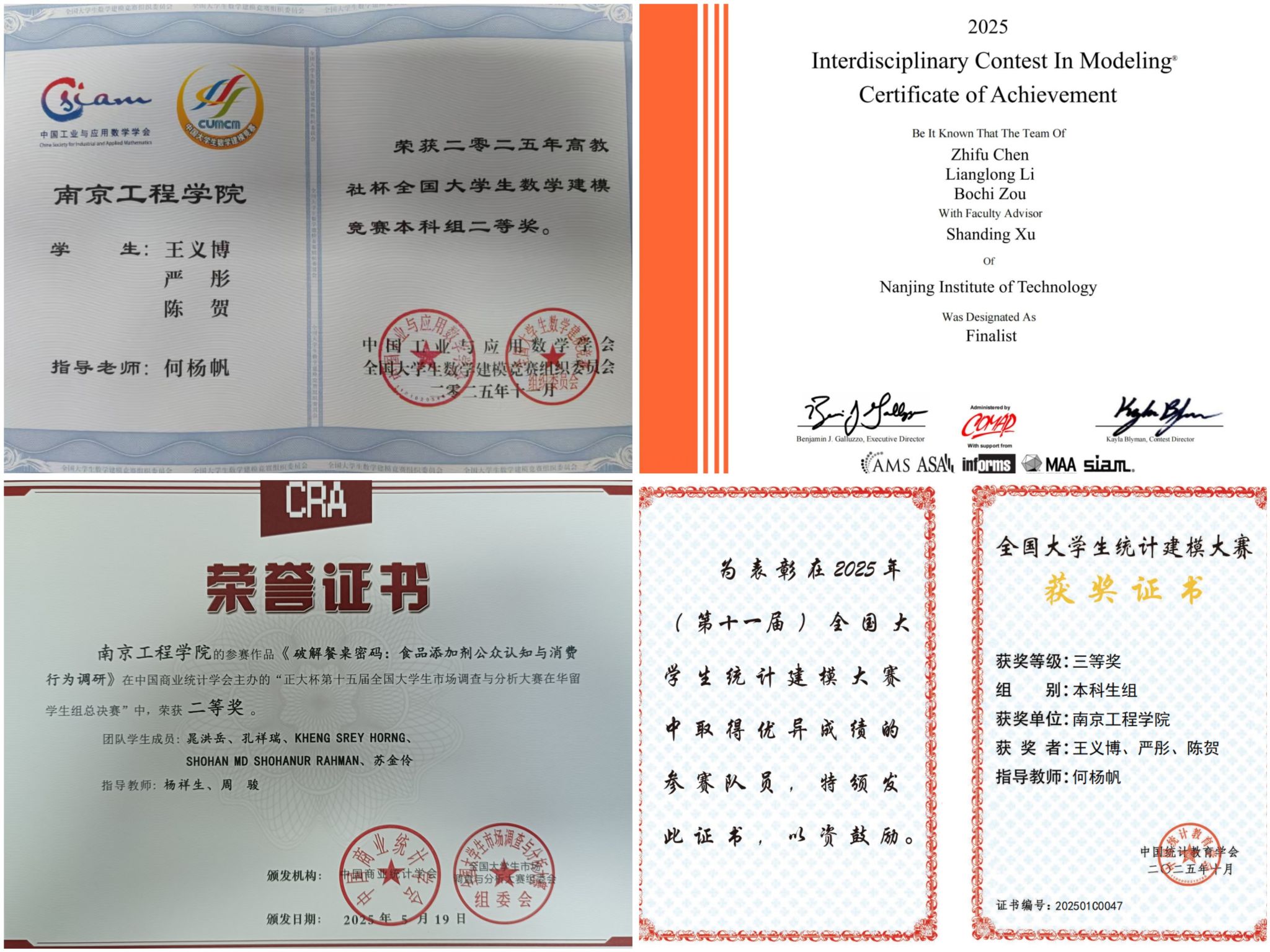 在美国大学生数学建模竞赛(MCM/ICM)中,我校学子与全球1700余所高校同场竞技,首次获得特等奖提名奖(F奖)1项,并斩获一等奖(M奖)2项、二等奖(H奖)4项。在全国大学生数学建模竞赛中,我校参赛团队荣获全国二等奖1项,省级一等奖2项、二等奖2项、三等奖10项,整体成绩位居全国同类高校前列。在第十五届全国大学生市场调查与分析大赛中,学生团队获全国二等奖2项、全国三等奖1项;省级赛中获一等奖5项、二等奖7项、三等奖9项,表现突出。在第十一届全国大学生统计建模大赛中,我校获得全国三等奖1项,省级一等奖1项、二等奖4项、三等奖5项,体现了学生在统计建模与数据科学领域的扎实能力。