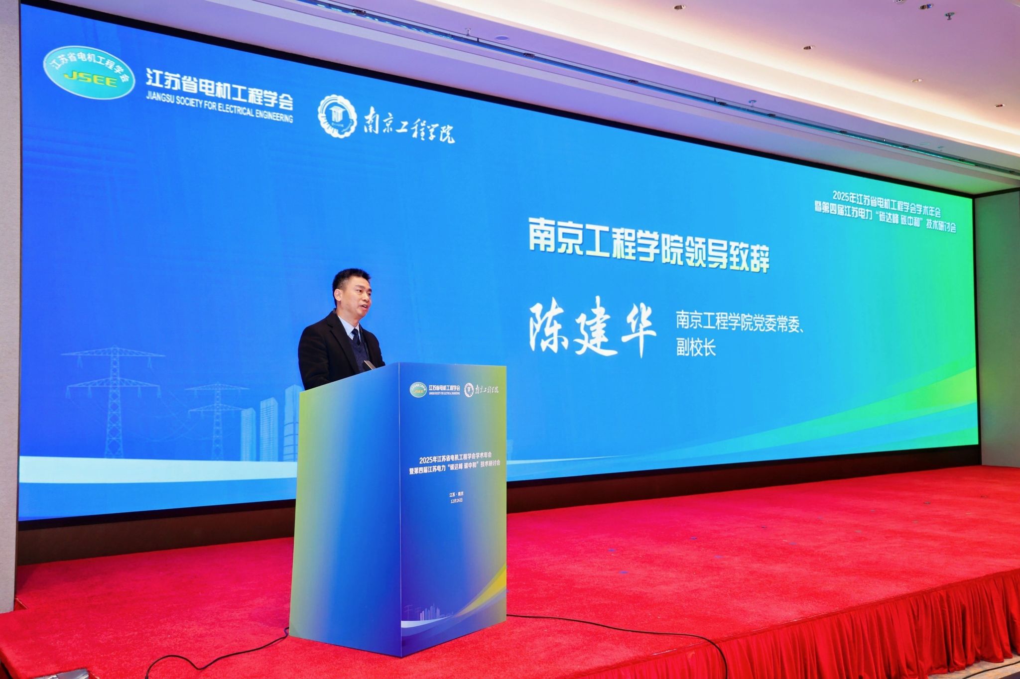 陈建华在致辞中表示,实现“双碳”目标是一项广泛而深刻的社会变革,需要政、产、学、研各界协同努力。学校将依托电力学科优势,推动人工智能在能源电力领域的教学、科研与产业应用,为电力行业智慧化转型培养复合型人才,助力江苏电力能源高质量发展。