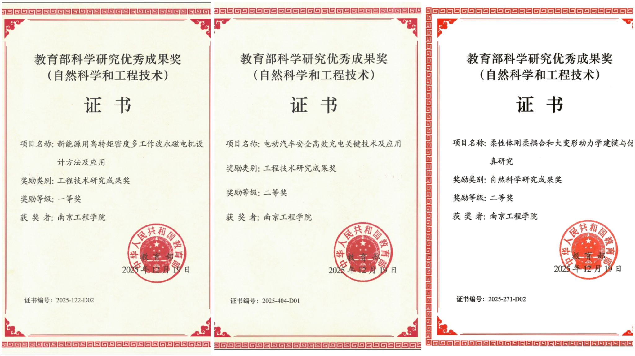 近日,教育部公布了2025年度高等学校科学研究优秀成果奖(自然科学和工程技术)评审结果,我校共有3项成果获奖,包括一等奖1项、二等奖2项,展现出学校在相关领域的科技创新与服务能力持续提升。由我校作为第一完成单位、张仰飞教授主持的“电动汽车安全高效充电关键技术及应用”项目获工程技术研究成果奖二等奖;赵文祥教授主要参与完成的“新能源用高转矩密度多工作波永磁电机设计方法及应用”项目获工程技术研究成果奖一等奖;方建士教授参与完成的“柔性体刚柔耦合大变形动力学建模与仿真研究”项目获自然科学研究成果奖二等奖。