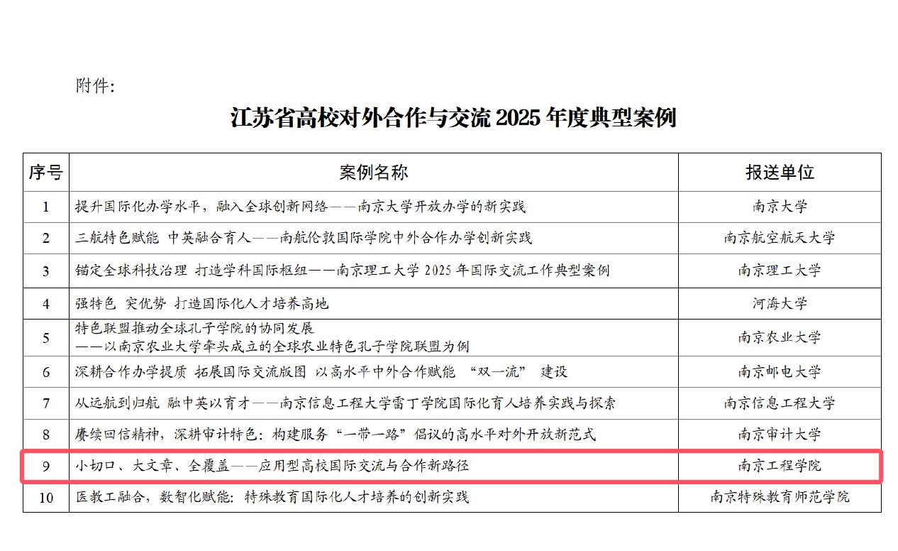 此次入选,彰显了学校在国际合作与交流领域的创新成效,为应用型高校国际化发展提供了可借鉴的经验,也是对学校“一流对外合作工程”实施成效的检验。下一步,学校将进一步深化“1+1+N”模式内涵,优化“一院一校”对标机制,做强实体平台辐射效能,持续推动国际合作从“实质落地”向“品牌提升”跨越,为服务国家“一带一路”倡议和江苏教育强省建设贡献更多南工程力量。