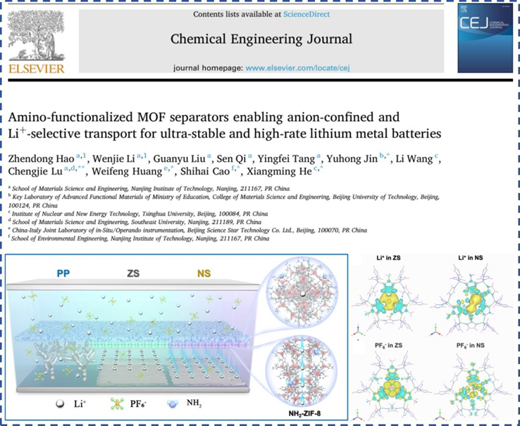 近日,我校材料科学与工程学院郝振东博士以第一作者、南京工程学院为第一署名单位,联合北京工业大学、清华大学等单位,在国际权威期刊《Chemical Engineering Journal》上发表题为“Amino-functionalized MOF separators enabling anion-confined and Li+-selective transport for ultra-stable and high-rate lithium metal batteries”的学术论文,为高能量密度锂金属电池的界面优化与功能隔膜设计提供了全新的研究视角与实现路径。《Chemical Engineering Journal》是一本国际性、跨学科的一区期刊,专注于化学工程、材料工程、能源存储等前沿领域,影响因子为13.2。