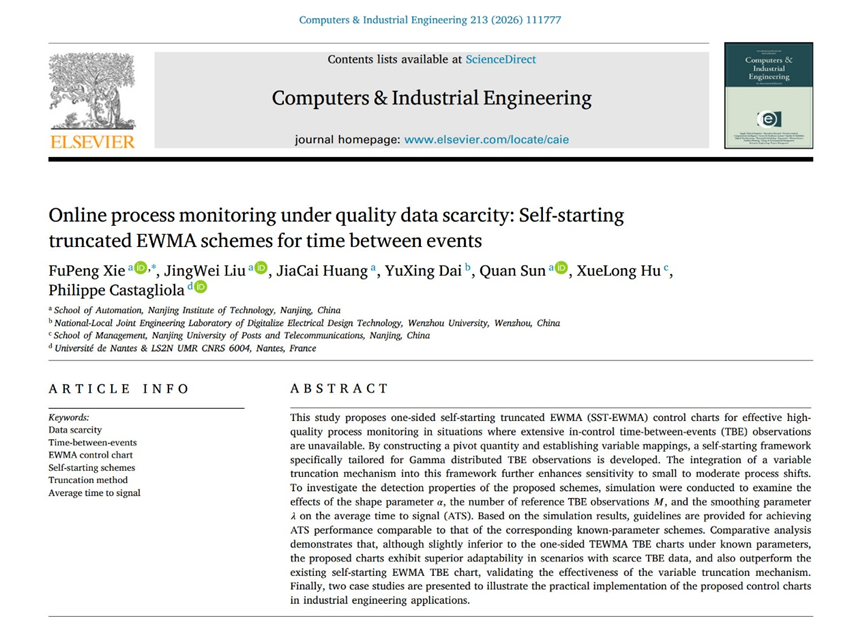 近日,我校自动化学院谢富鹏博士以第一作者及通讯作者,南京工程学院为第一署名单位,联合温州大学、南京邮电大学、法国南特大学等单位,在国际权威期刊《Computers & Industrial Engineering》上发表题为:“Online process monitoring under quality data scarcity: Self-starting truncated EWMA schemes for time between events”的学术论文。该期刊为工程技术大类一区TOP期刊,聚焦计算机技术与工业工程交叉领域的前沿研究,当前影响因子为6.5。