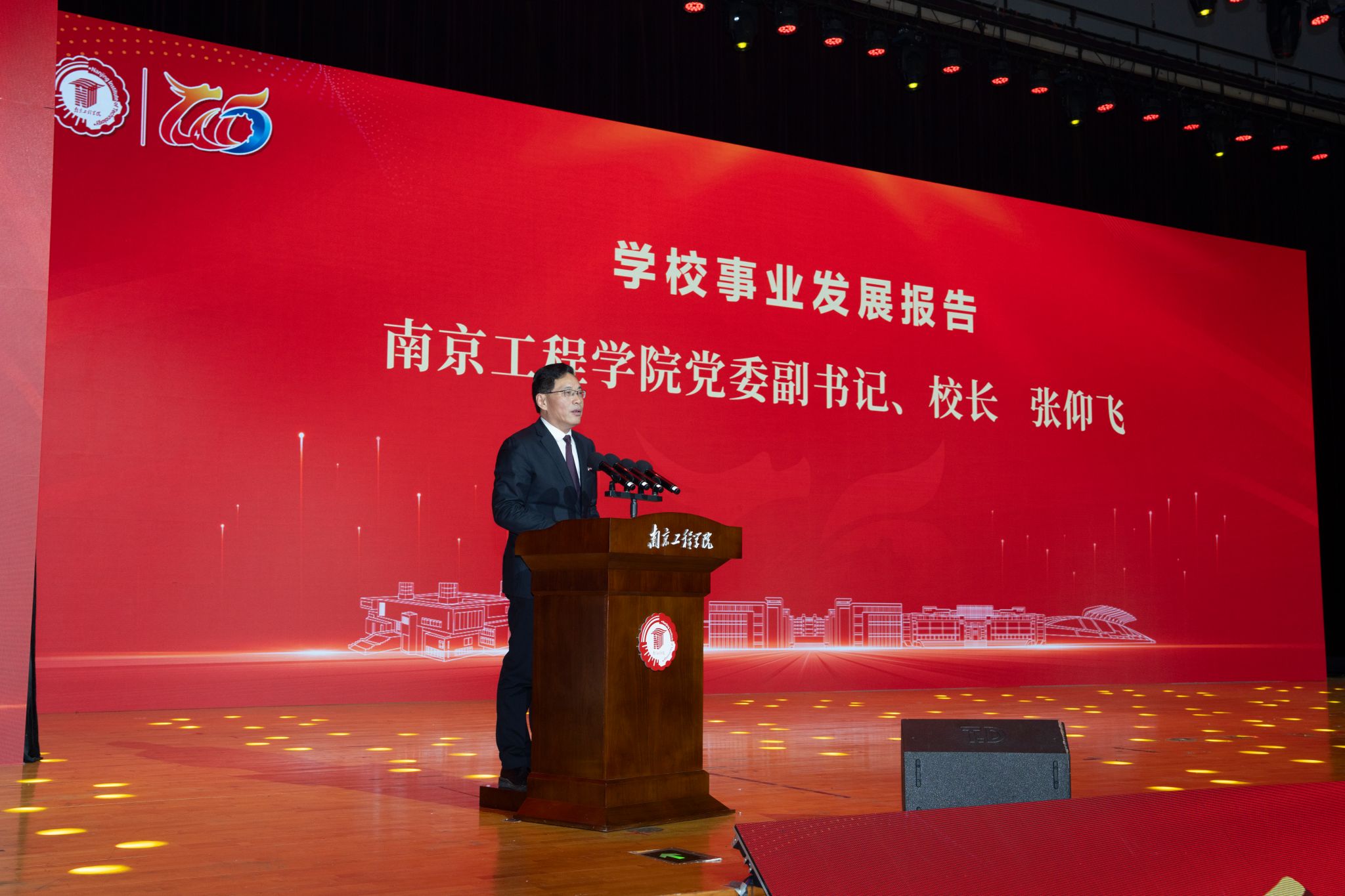 党委副书记、校长张仰飞作学校高质量发展报告。他代表全校师生员工对出席大会的各级领导、各位嘉宾、广大校友以及社会各界朋友表示热烈欢迎和衷心感谢,并系统回顾了学校发展变迁中的重要历史时刻以及取得的高质量发展成效。他指出,南京工程学院将高远发展,以更高历史站位、更广国际视野,培养更多高素质应用创新人才;将融合发展,担当教育强国使命,融入江苏,融入行业,高水平合作、高质量服务;将创新发展,以实力筑高峰,以特色显优势,矢志建成国内领先、特色鲜明的一流应用型大学,为推进中国式现代化江苏新实践作出新的更大贡献。