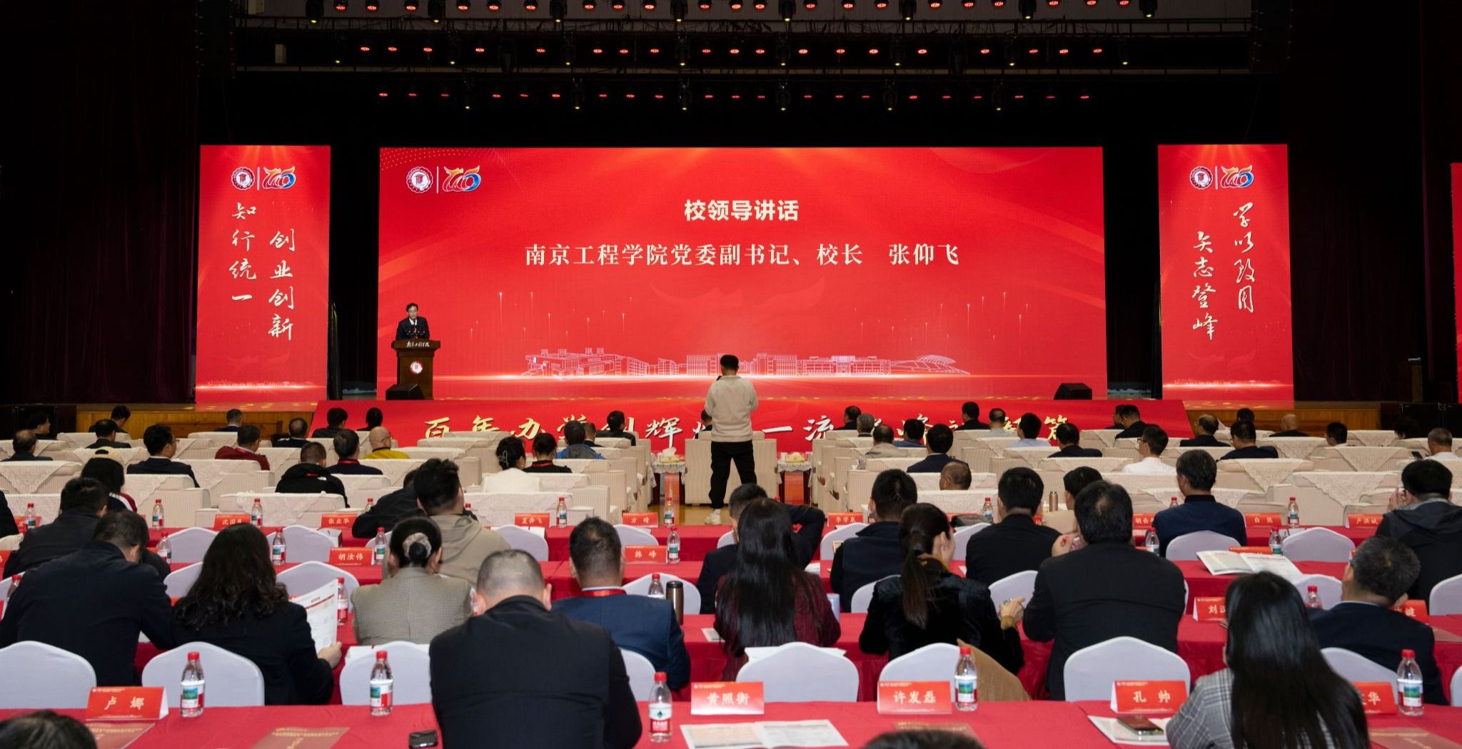 11月8日下午,南京工程学院校友会第四届会员代表大会暨理事会换届会议、校地融合推介大会在天健苑·体育中心主馆举行。本次大会以“凝聚校友力量,共促校地融合”为主题,党委书记孙爱武,党委副书记、校长张仰飞,党委副书记濮励杰,党委常委、副校长汪群,副校长包永强,党委常委、副校长陈建华,第三届理事会成员代表,各地区及行业校友会负责人,二级学院校友工作负责人,校友代表及江宁区相关部门负责同志共同参与。会议由濮励杰主持。