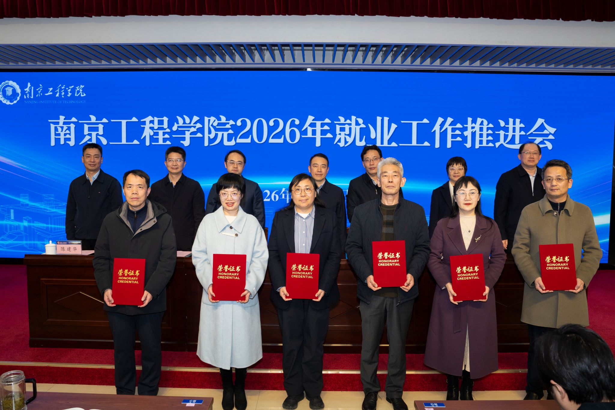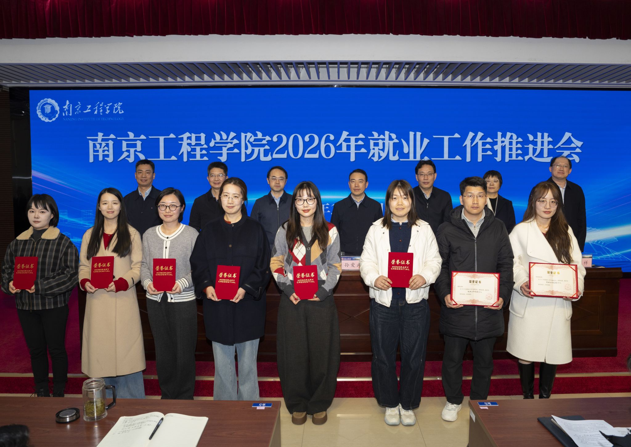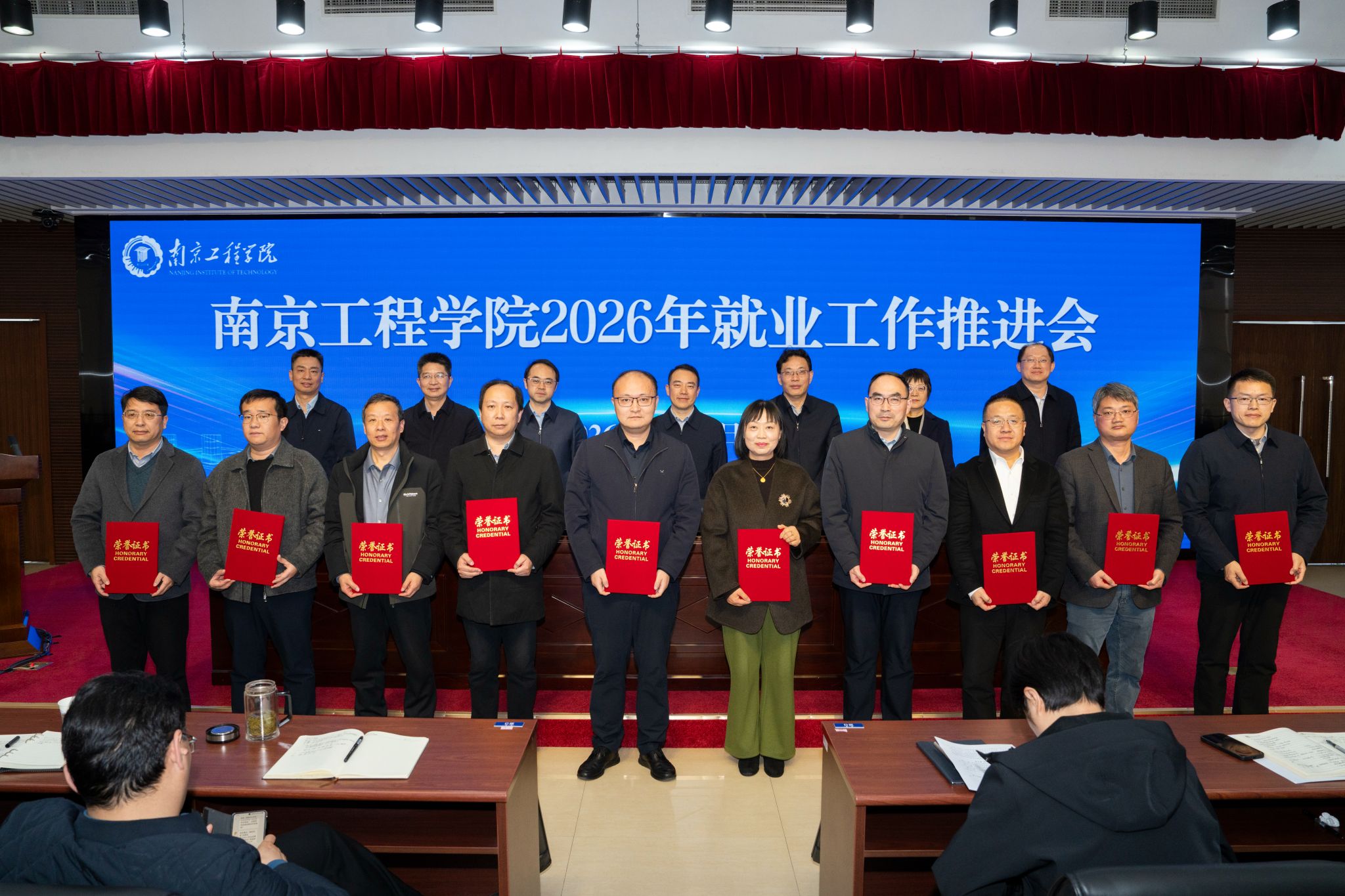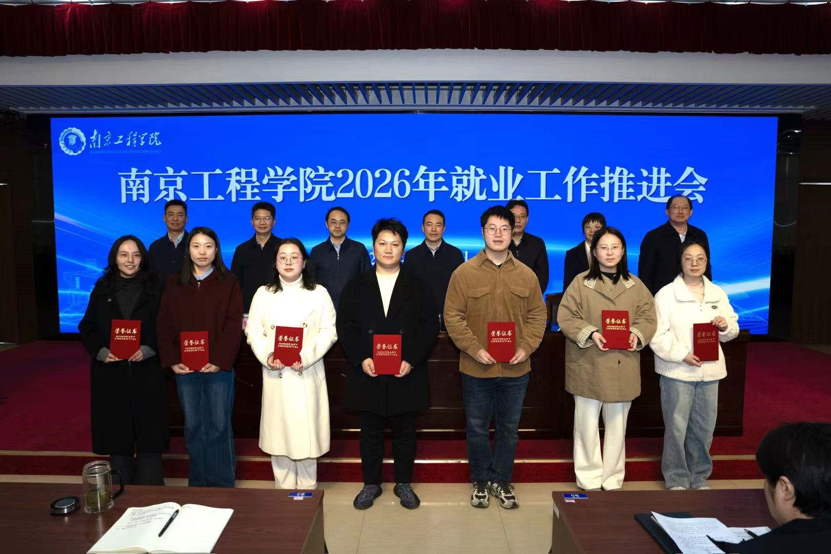党委副书记单晓峰宣读2025年度就业工作表彰决定。机械工程学院等5个单位荣获“就业工作先进集体”,自动化学院等3个单位荣获“就业工作奋进奖”,能源与动力工程学院等3个单位荣获“升学出国奋进奖”,许倩等15名同志荣获“就业工作先进个人”,还有10个案例获评“就业工作典型案例”。与会校领导为获得表彰的先进集体和先进个人颁发荣誉证书。