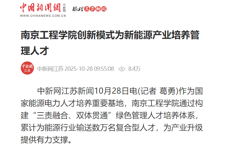 中新网江苏新闻10月28日电(记者 葛勇)作为国家能源电力人才培养重要基地,南京工程学院通过构建“三责融合、双体贯通”绿色管理人才培养体系,累计为能源行业输送数万名复合型人才,为产业升级提供有力支撑。