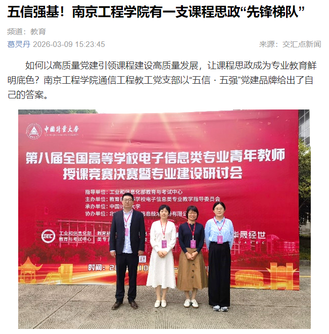 如何以高质量党建引领课程建设高质量发展,让课程思政成为专业教育鲜明底色?南京工程学院通信工程教工党支部以“五信・五强”党建品牌给出了自己的答案。