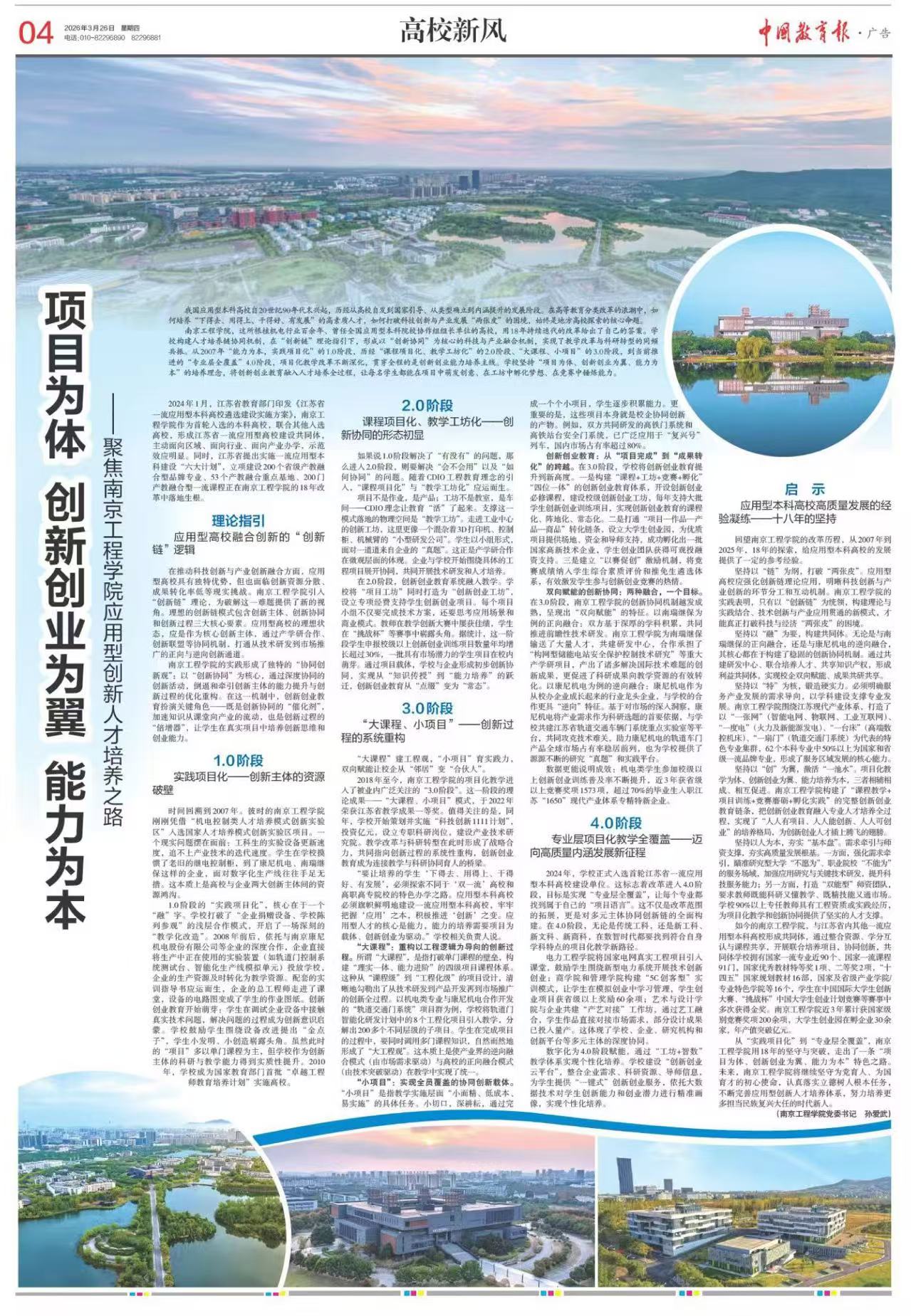 从“实践项目化”到“专业层全覆盖”,南京工程学院用18年的坚守与突破,走出了一条“项目为体、创新创业为翼、能力为本”特色之路。未来,南京工程学院将继续坚守为党育人、为国育才的初心使命,认真落实立德树人根本任务,不断完善应用型创新人才培养体系,努力培养更多担当民族复兴大任的时代新人。