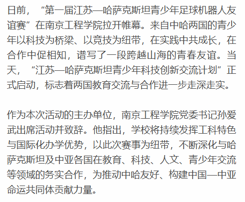 日前,“第一届江苏—哈萨克斯坦青少年足球机器人友谊赛”在南京工程学院拉开帷幕。来自中哈两国的青少年以科技为桥梁、以竞技为纽带,在实践中共成长,在合作中促相知,谱写了一段跨越山海的青春友谊。当天,“江苏—哈萨克斯坦青少年科技创新交流计划”正式启动,标志着两国教育交流与合作进一步走深走实。