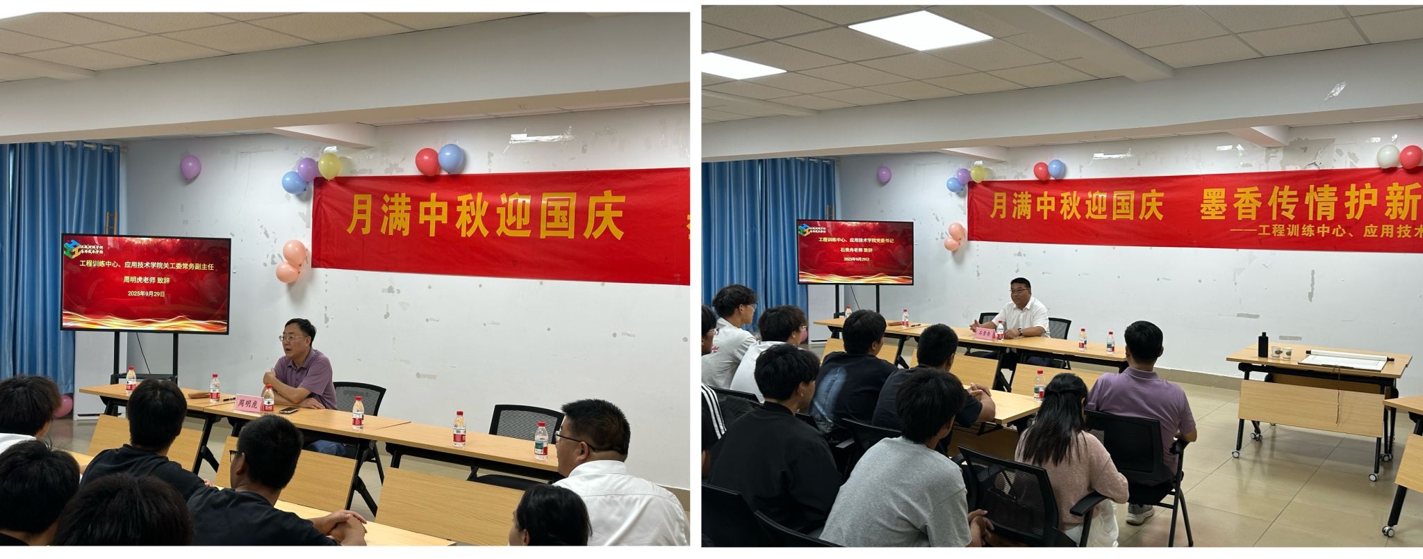 双节将至,为营造喜庆祥和的氛围,助力2025级新生更好地融入大学生活,9月29日,工程训练中心、应用技术学院党委书记石贵舟,党委副书记班生,关工委常务副主任周明虎走进北区萃园9栋L303“一站式”学生社区,举办“月满中秋迎国庆 墨香传情护新航”主题活动。