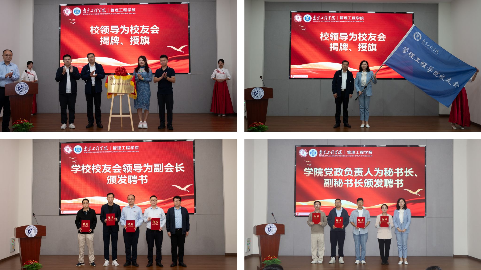 张玉清与三位荣誉会长共同为管理工程学院校友会揭牌,并为校友会会长、管理工程学院党委书记徐娟授旗。与会领导依次为新当选理事会成员颁发聘书。