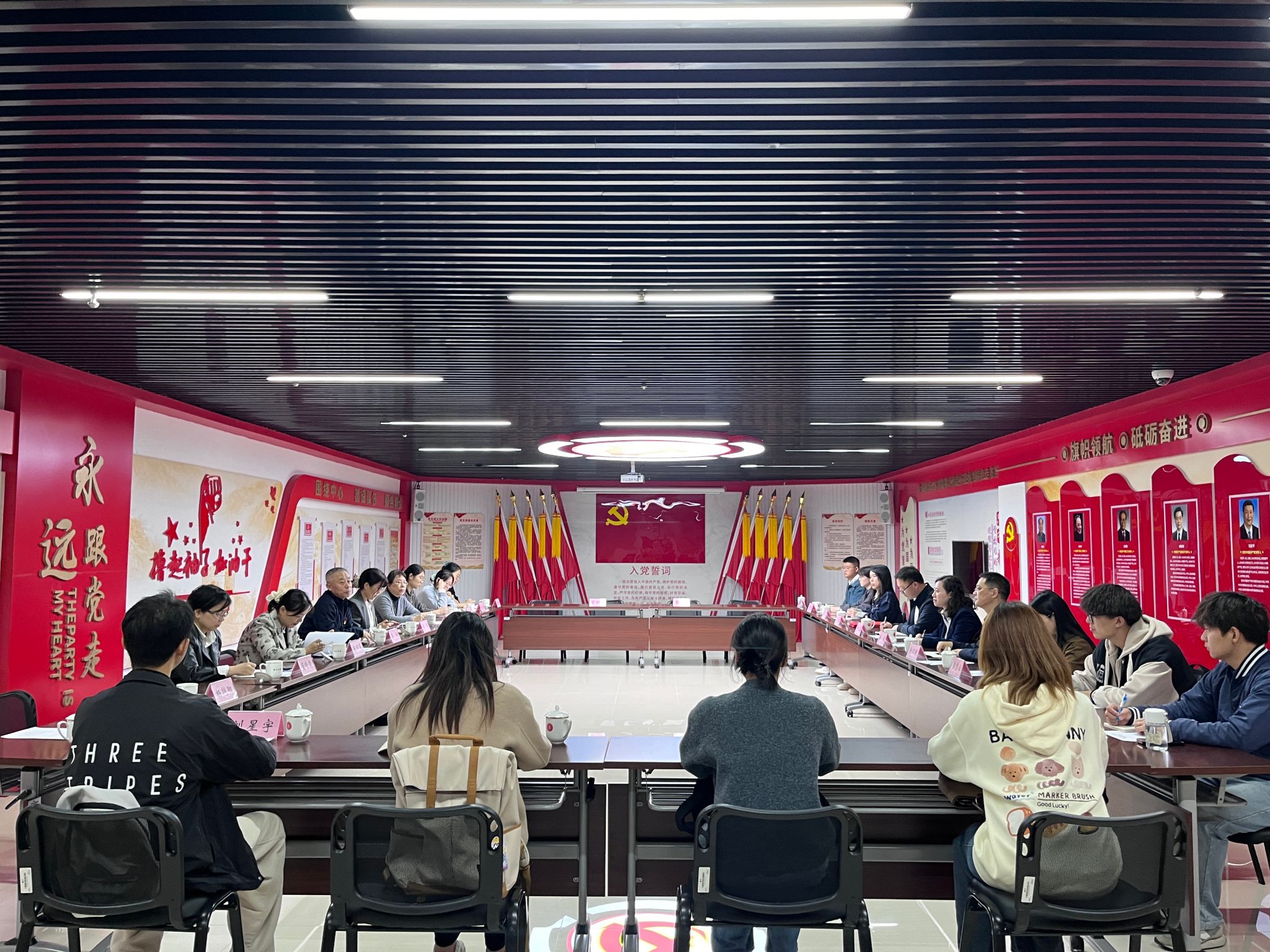 会前,师生们观看了专题宣传片《牢记嘱托 筑梦兰台》,并参观了长三角地区新四军档案史料展。大量珍贵的原始档案与历史图片,将革命先辈的奋斗足迹与牺牲精神转化为可触可感的细节,为全体党员上了一堂入脑入心的“行走的党课”。