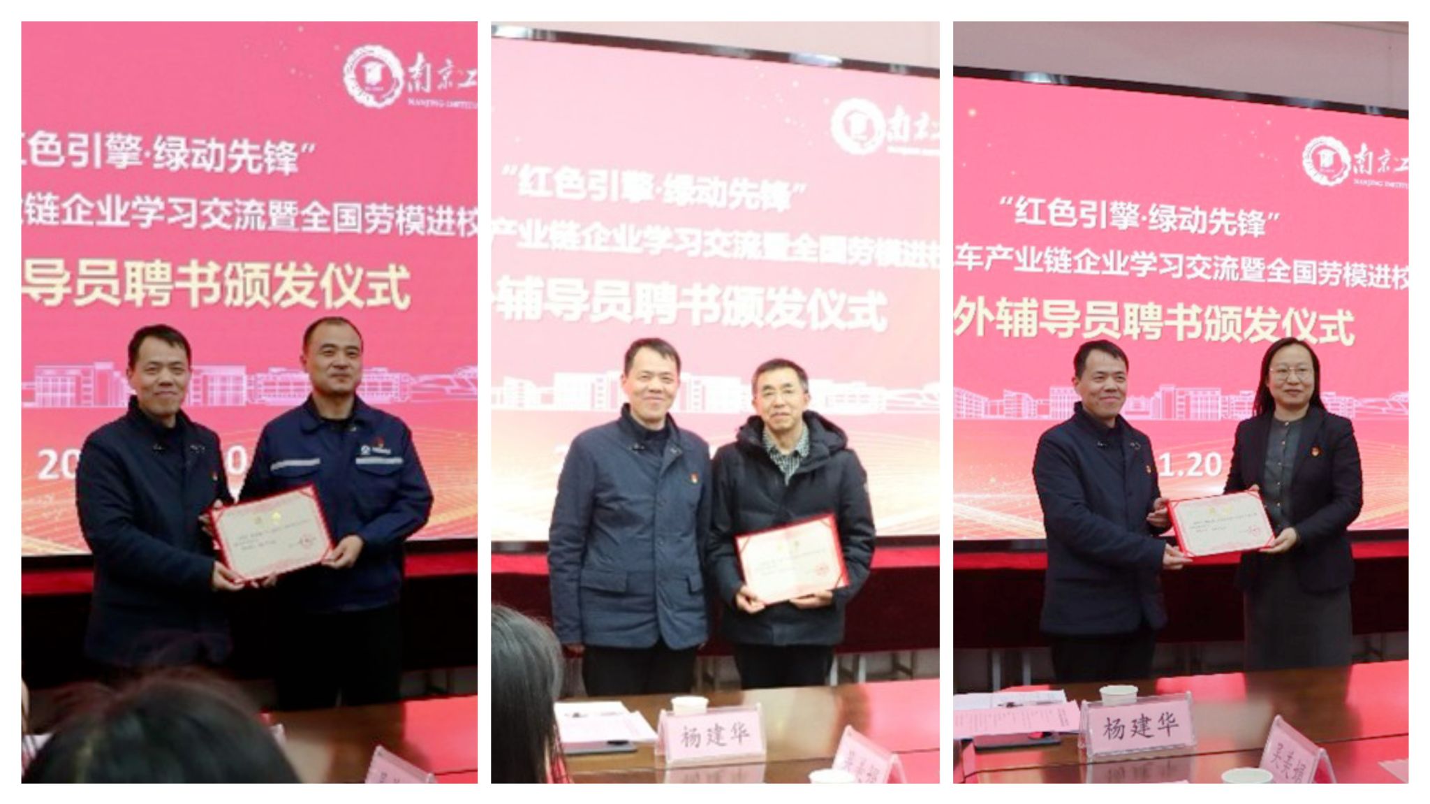 现场举行了简朴而庄重的课外辅导员聘书颁发仪式,全国劳模张力生、余伟伟及江苏省劳模杨小丽正式受聘为学院课外辅导员。三位劳模以自身卓越的奋斗事迹,激励新一代青年在专业道路上精益求精、勇攀高峰。上汽大通南京分公司党委副书记顾伟红分享了行业发展愿景,中汽创智专家带来“智驾未来——解锁智能汽车时代的职业新赛道”主题分享。江宁区工信局局长陈炳晖到场见证,并对工会以劳模精神为引领、服务师生成长的举措给予高度肯定。