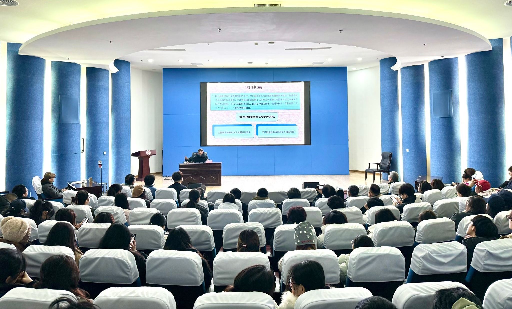 12月24日,艺术与设计学院在图书馆二楼报告厅举办“艺·兴美育大讲堂”第六期活动,苏州大学艺术学院张朋川教授受邀作题为“文徵明的园林画”美育讲座,学院院长杨成立及200余名师生参加活动。