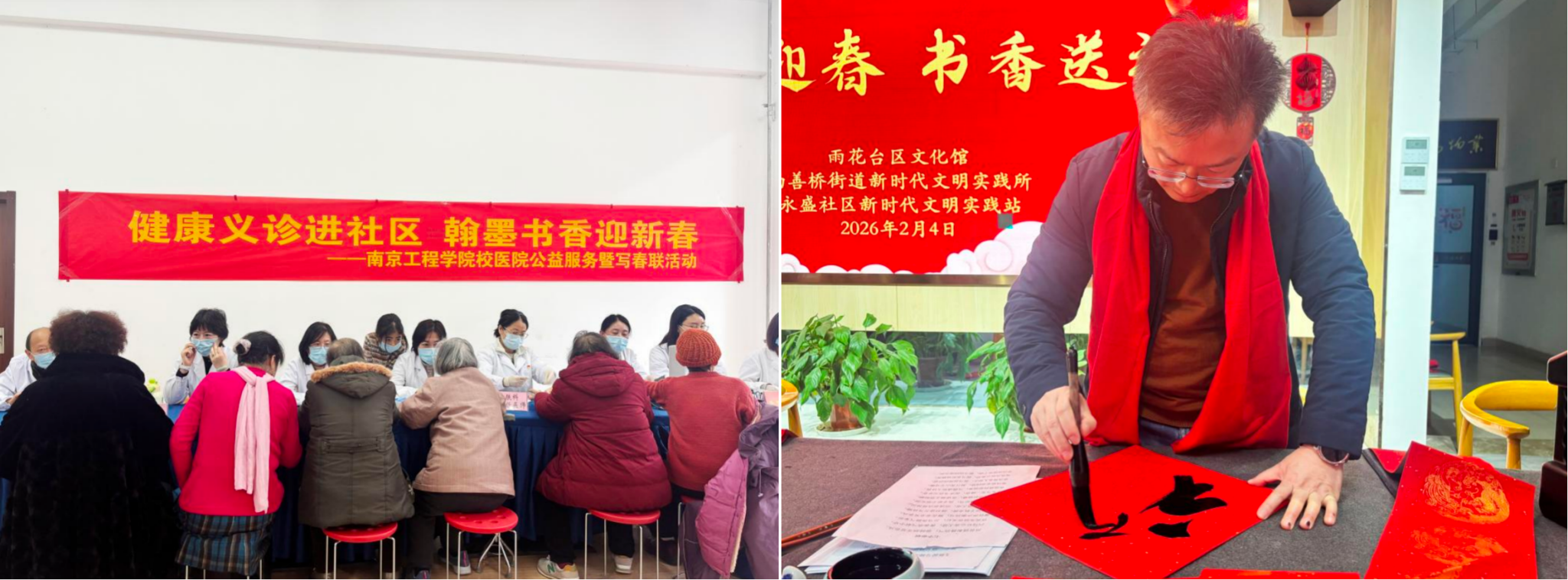 活动现场,校医院医护人员组成义诊团队,为居民提供血压血糖测量、健康咨询及慢性病防治指导等服务,并结合冬季疾病特点讲解科学用药与预防知识,帮助居民提升健康管理能力。同时,现场洋溢着喜庆的迎春氛围,叶长青挥毫泼墨,为居民书写春联。“手写的春联更有年味”,一位手持春联的居民笑着说道。
