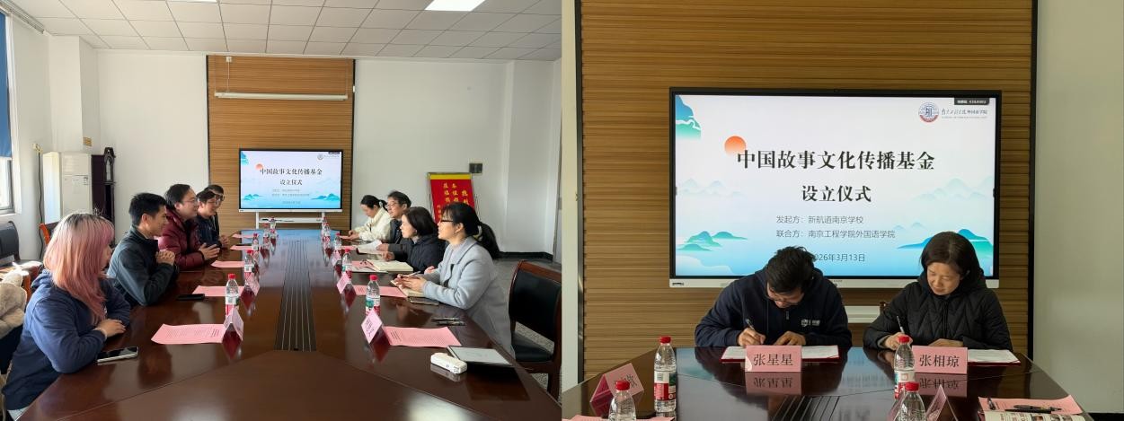 3月13日,外国语学院与新航道南京学校举行“中国故事文化传播基金”设立签约仪式。学院党委书记张相琼、党委副书记胡晓清及教师代表,新航道南京学校校长沈重阳等参加仪式。