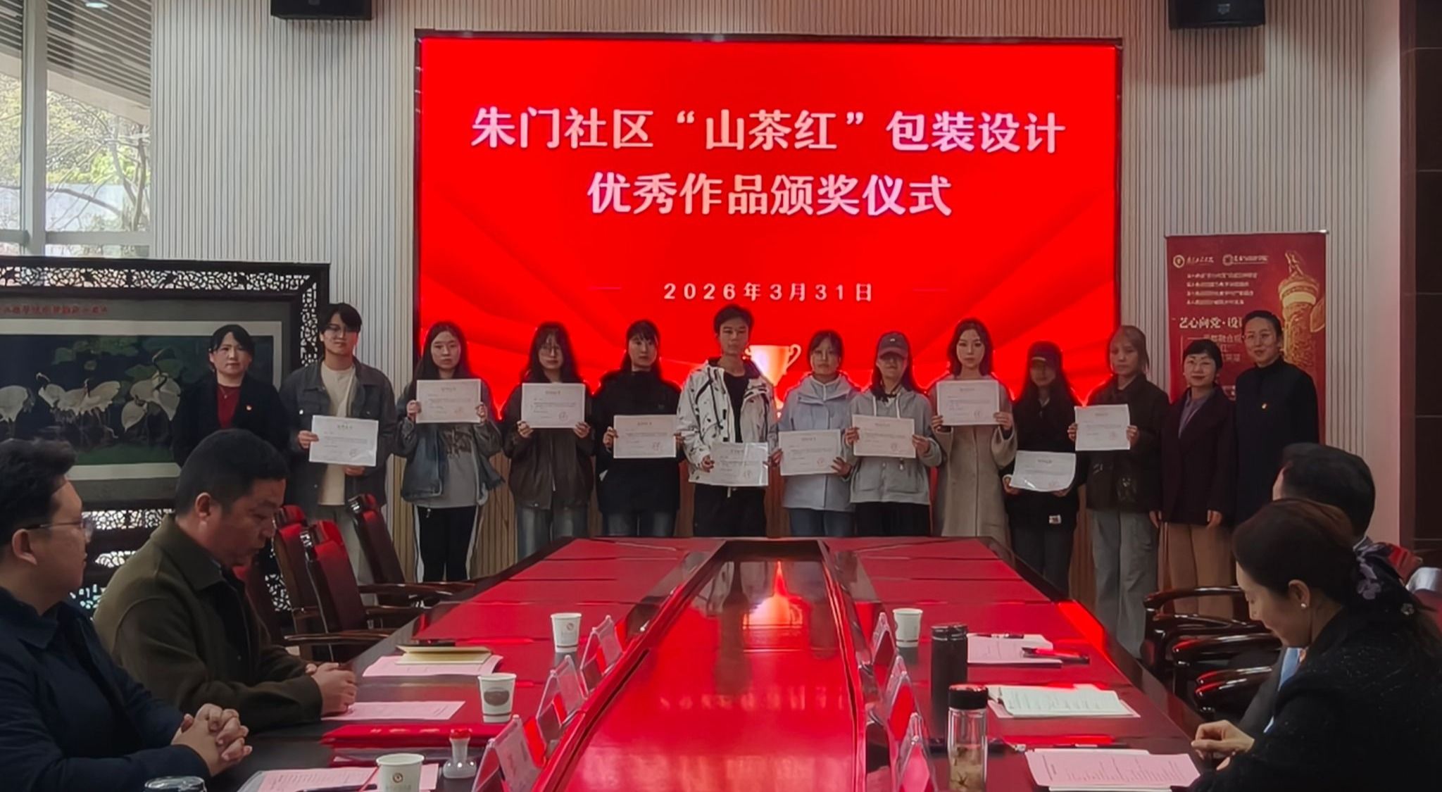 签约仪式后,双方共同参观“山茶红”包装设计成果展。本次展览是《文化衍生品设计》《版面设计》课程实践成果,以党建共建为纽带,联动朱门社区开展茶包装设计项目,共展出102件版面成果,其中10件被评为“优秀”。双方领导为获奖学生代表颁奖,对同学们以设计赋能乡村发展的实践成果给予肯定。