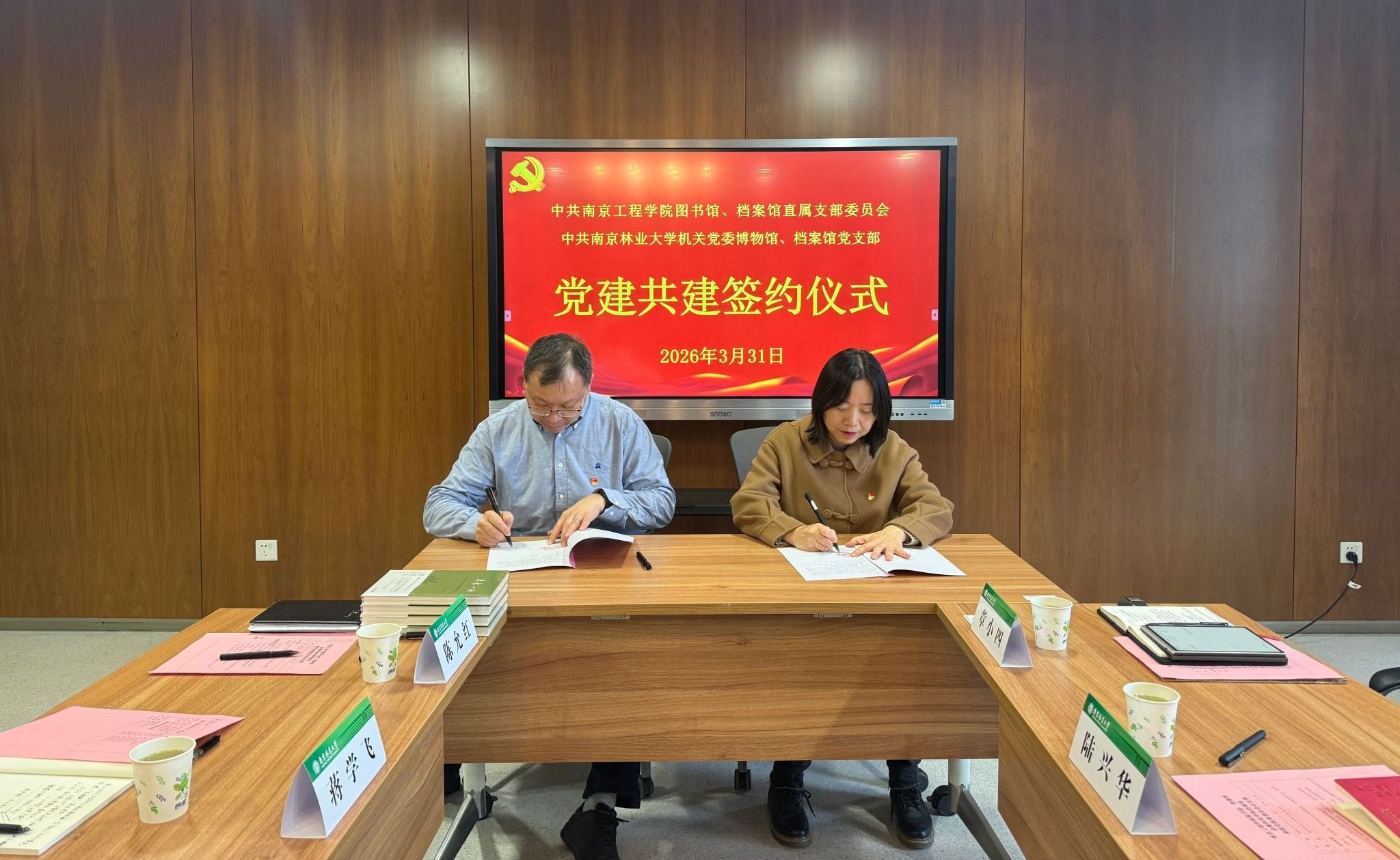 会上,双方举行党建共建签约仪式,签署党建共建协议书。南京林业大学博物馆、档案馆党支部向图书馆、档案馆直属党支部赠送馆藏图书。双方表示,将依托党建共建平台建立常态化沟通机制,在档案资源共享、校史文化研究、信息化平台建设等领域深化合作,充分发挥档案工作存史资政育人作用,共同服务学校高质量发展。