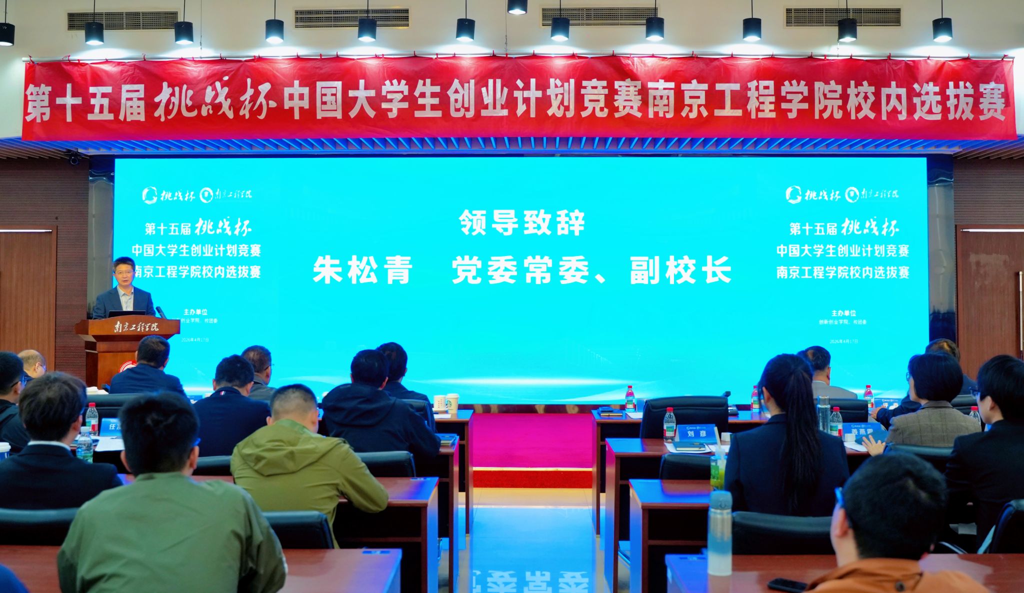 4月17日下午,创新创业学院举行第十五届 “挑战杯” 中国大学生创业计划竞赛校内选拔赛,党委常委、副校长朱松青出席活动并致辞。来自校外的创新创业领域专家、企业与创投界代表担任评委,各学院双创工作负责人、双创管理人员、参赛师生团队等近200人参加活动。