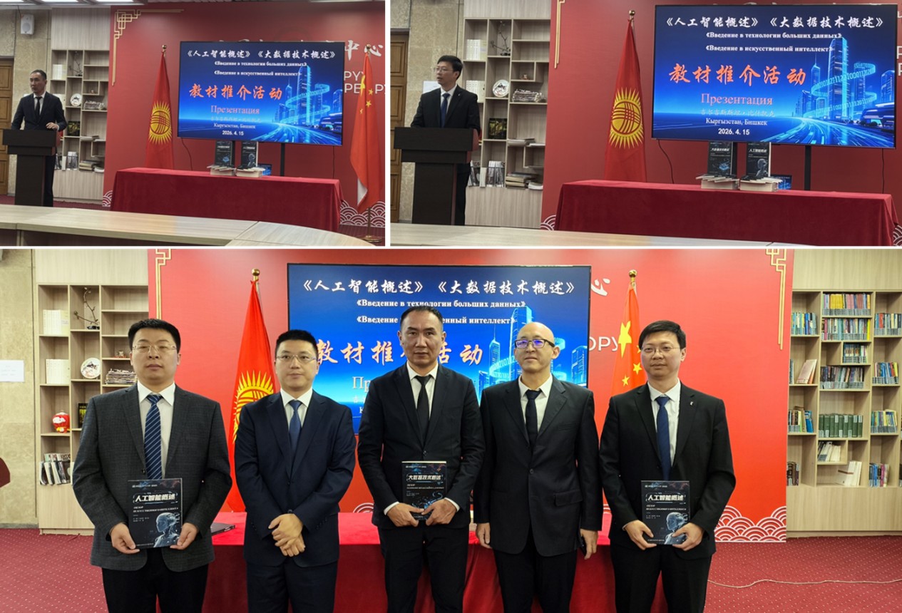 代表团还赴吉尔吉斯斯坦国家图书馆举行教材推介活动,联合奥什国立大学BEKTUR院长、奥什国立大学孔子学院托克托逊院长和安德源院长,以及江苏凤凰高等教育出版有限公司刘一波副总经理、姚喆主任,举办《人工智能概述》《大数据技术概述》首发仪式。BEKTUR和朱昊分别致辞,感谢参与编写与出版的中吉双方教师,肯定教材对课程建设、知识传播和中吉教育合作的积极作用。仪式上,与会嘉宾共同向吉尔吉斯国家图书馆及奥什国立大学师生代表赠送教材。