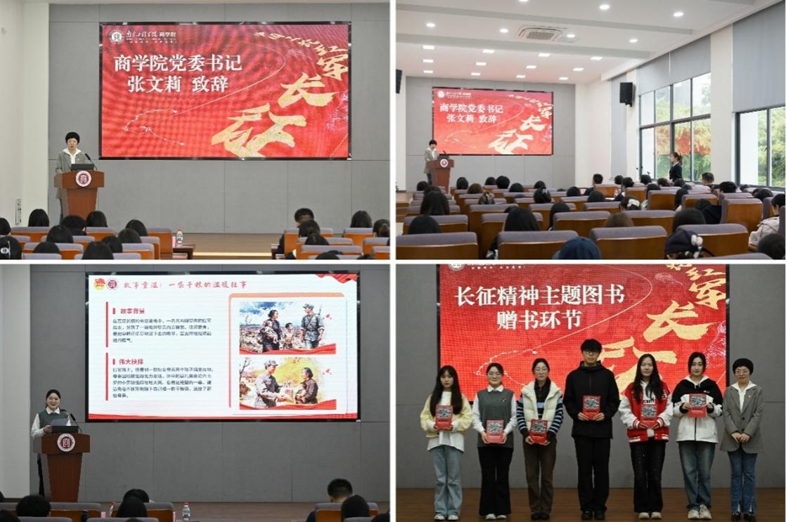 学院党委书记张文莉以“爱读书、读好书、善读书”为题,重温习近平总书记关于读书的重要论述,鼓励同学们以书为伴、以史为鉴,在阅读红色经典中汲取精神力量,从长征英雄故事中感悟长征精神,将其内化于心、外化于行,在新时代的长征路上奋勇前进。六位学生党员和入党积极分子深情讲述了“七根火柴”“半截皮带”“铁血师长陈树湘”等长征英雄故事,生动再现了红军战士的坚守与担当。一个个红色故事镌刻着不怕牺牲、排除万难、争取胜利的长征精神,令在场师生深受触动。学院还向同学们赠送了长征精神学习书籍,大家纷纷表示要从红色故事中汲取力量,传承长征精神,坚定理想信念。