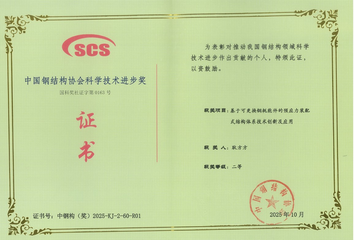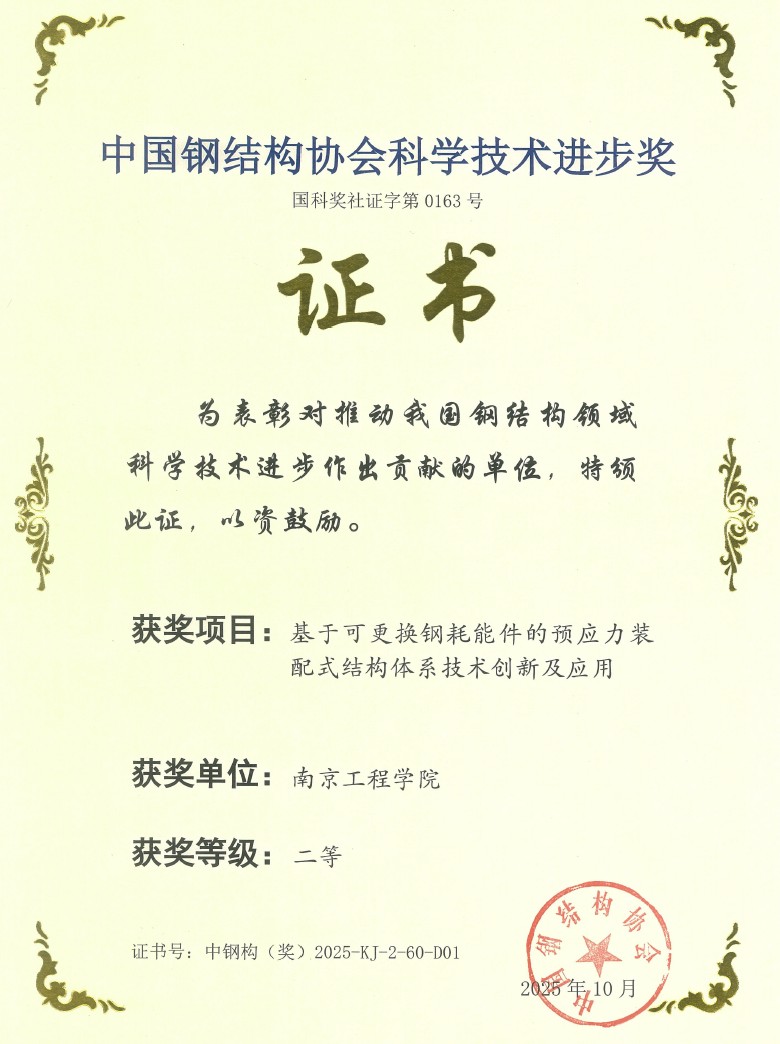 10月13-15日,在广西南宁召开的“中国钢结构协会第九届会员代表大会暨2025中国钢结构大会”上,2025年度中国钢结构协会科学技术奖正式揭晓。我校建筑工程学院耿方方教授牵头的“基于可更换钢耗能件的预应力装配式结构体系技术创新与应用”项目荣获科学技术进步二等奖。
