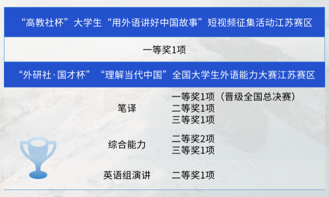 近日,我校学子在两项外语竞赛中表现突出,分别在2025年“高教社杯”大学生“用外语讲好中国故事”短视频征集活动和“外研社·国才杯”“理解当代中国”全国大学生外语能力大赛江苏赛区比赛中荣获多个奖项。