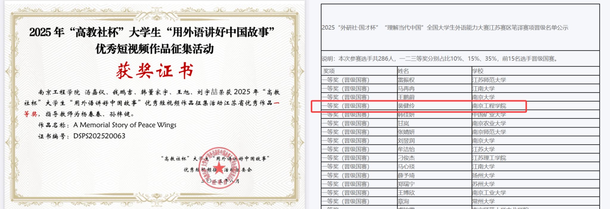在“高教社杯”大学生“用外语讲好中国故事”短视频征集活动江苏赛区评选中,由外国语学院学生汤嘉仪团队创作、杨春春与孙梓健老师指导的作品《A Memorial Story of Peace Wings》,从全省37件入围作品中脱颖而出,荣获一等奖,并被推荐参评第八届全国大学生网络文化节。