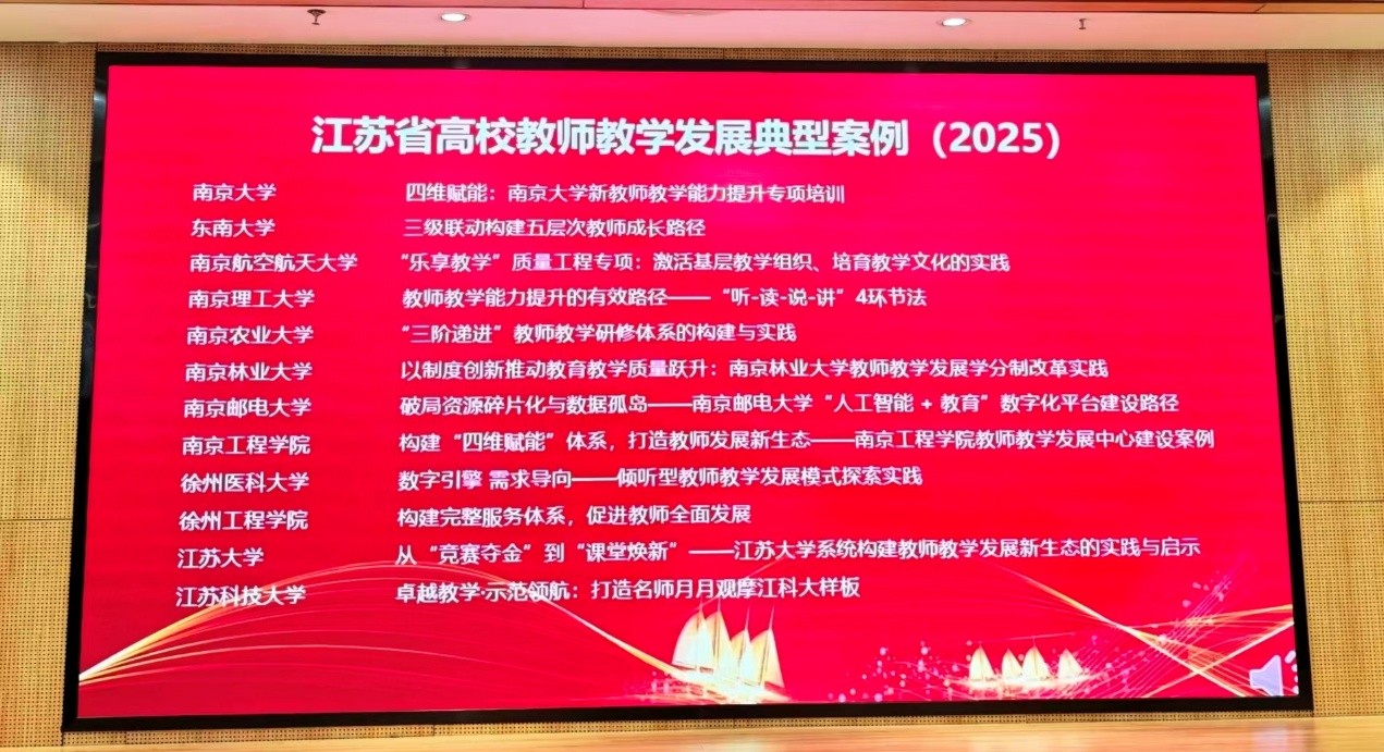11月18日至19日,江苏省高校教学管理研究会教学研究工作委员会暨第十一届江苏高校教师教学发展工作委员会学术年会在镇江举行。我校申报的《构建“四维赋能”体系,打造教师发展新生态——南京工程学院教师教学发展中心建设实践》成功入选江苏省高校教师教学发展典型案例,全省仅有12所高校获此荣誉。