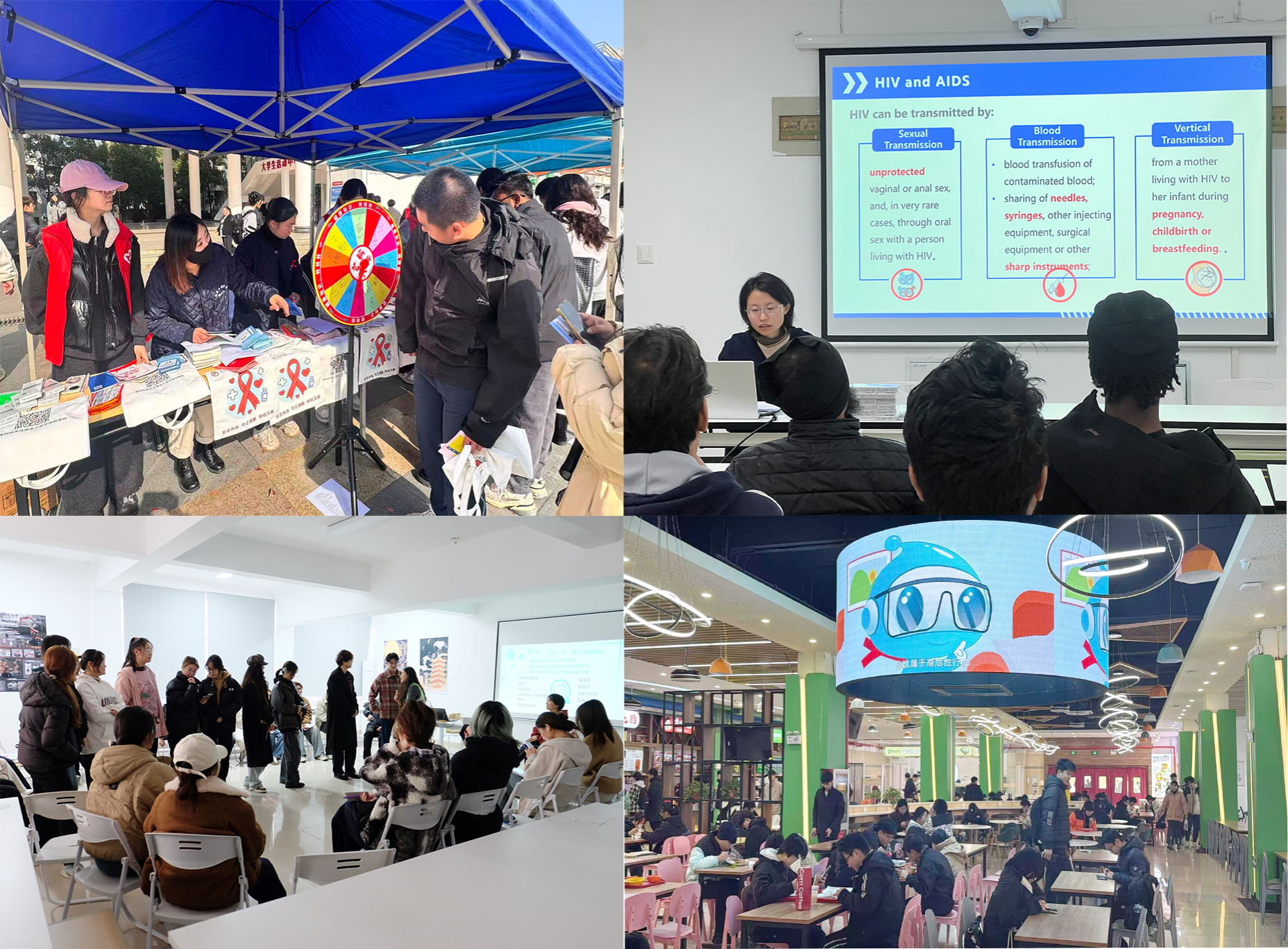 12月1日,校园活动现场设置了知识问答、互动游戏等环节,师生们在轻松愉快的氛围中学习了艾滋病防治知识。校医院医护人员与江宁区疾控专家现场提供健康咨询,志愿者们同时发放科普宣传资料。当天,江宁区疾控中心副主任医师金鑫受邀作《无“艾”青春 美好未来》专题讲座,结合真实案例系统讲解防治要点,引导学生树立“自身健康第一责任人”意识。此外,校医院许凯莉、朱启慧老师走进国际教育学院,为留学生开展全英文传染病防控讲座,提供有针对性的防艾科普服务。12月11日,校医院联合青禾社会工作服务中心,在艺术与设计学院一站式社区开展同伴教育活动,以贴近学生的交流方式传递健康防护理念。除了线下活动,学校还通过食堂电子屏全天候播放科普视频、在宿舍区张贴主题海报等方式,构建起“线上线下、课内课外”联动的立体宣传教育网络,持续营造校园健康文化氛围。