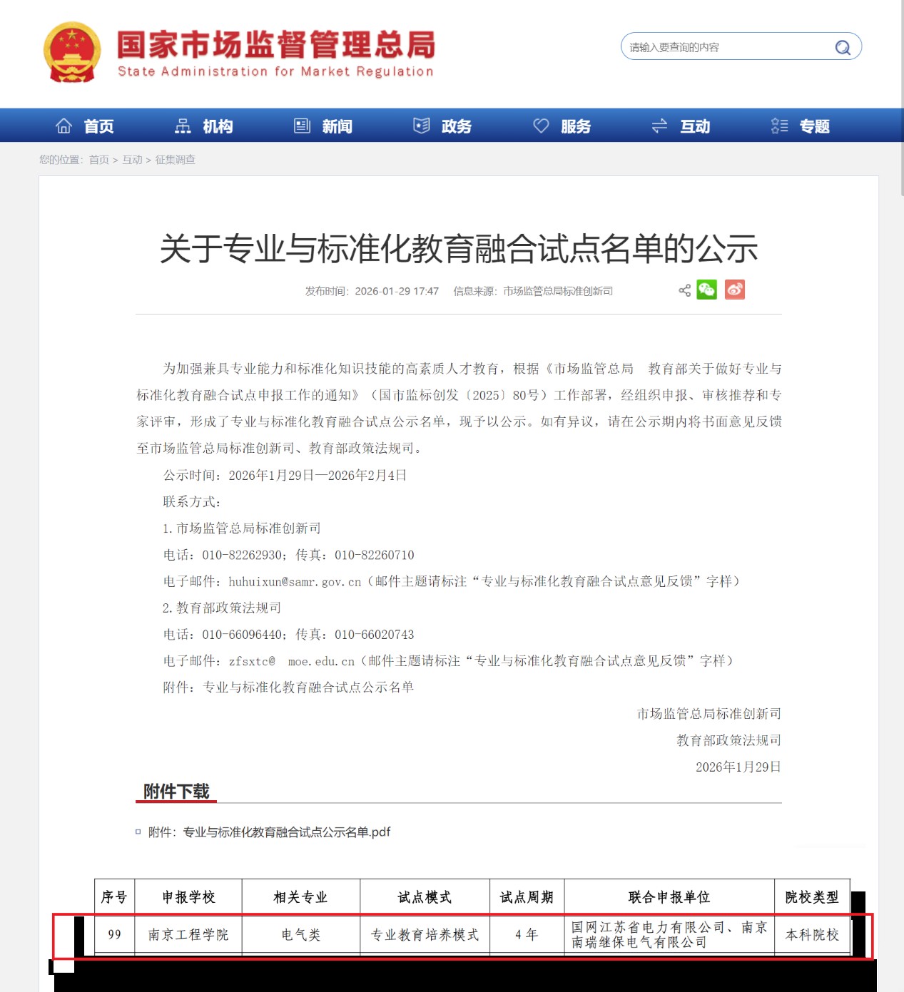 近日,国家市场监管总局标准创新司与教育部政策法规司联合公布了全国首批“专业与标准化教育融合试点”名单,共确立281个试点单位。由我校牵头,联合国网江苏省电力有限公司、南京南瑞继保电气有限公司共同申报的电气类专业试点项目成功入选,成为江苏省电气类专业中唯一获批的本科院校。这标志着学校在标准化人才培养模式改革方面取得新进展,将为电力行业标准化人才队伍建设注入新动能。