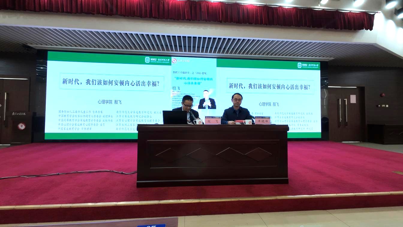 3月26日下午,学校举办“新时代,我们该如何安顿内心活出幸福”主题心理讲座。本次活动是校工会“教职工卓越讲堂”之“润心·愈见”系列活动之一,特邀南京师范大学家庭教育研究院副院长殷飞教授主讲,校党委副书记单晓峰主持,全校100余名分工会干部及辅导员到场聆听。