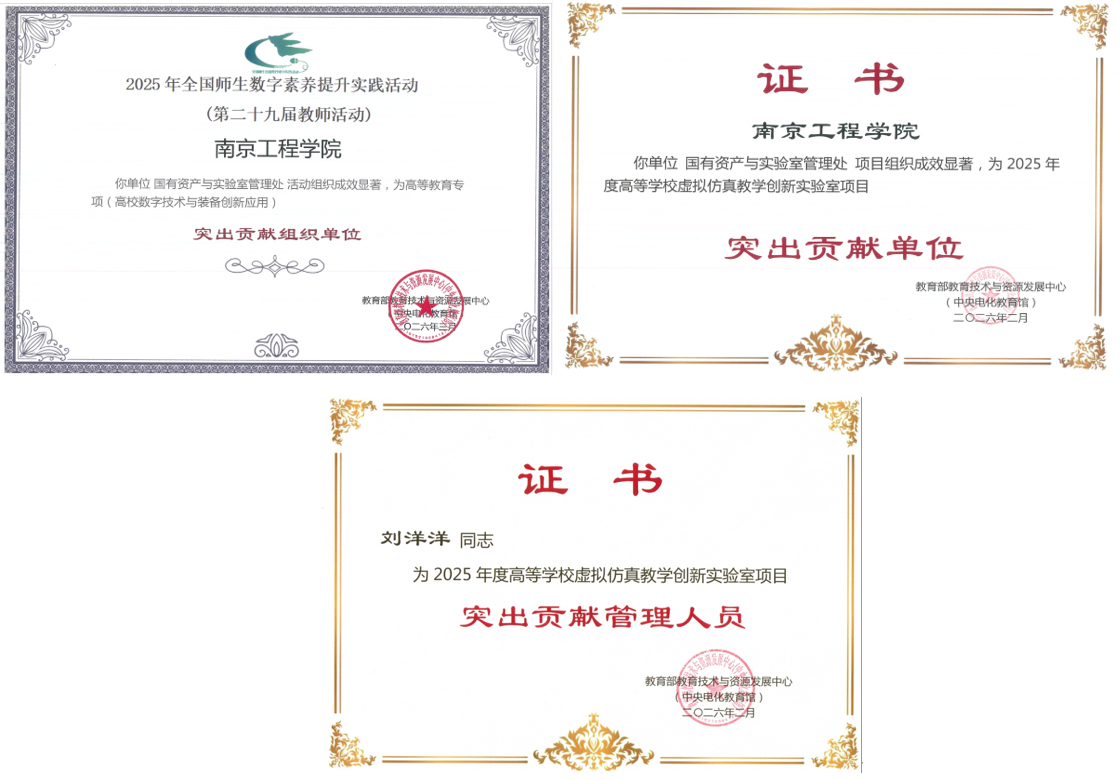 近日,2025年度全国师生数字素养提升实践活动高等教育专项(高校数字技术与装备创新应用)评选结果揭晓。我校荣获“2025年全国师生数字素养提升实践活动高等教育专项(高校数字技术与装备创新应用)突出贡献组织单位”(全国18家)和“2025年度高等学校虚拟仿真教学创新实验室项目突出贡献单位”(全国31家)荣誉称号。我校刘洋洋同志荣获“2025年度高等学校虚拟仿真教学创新实验室项目突出贡献管理人员”称号。