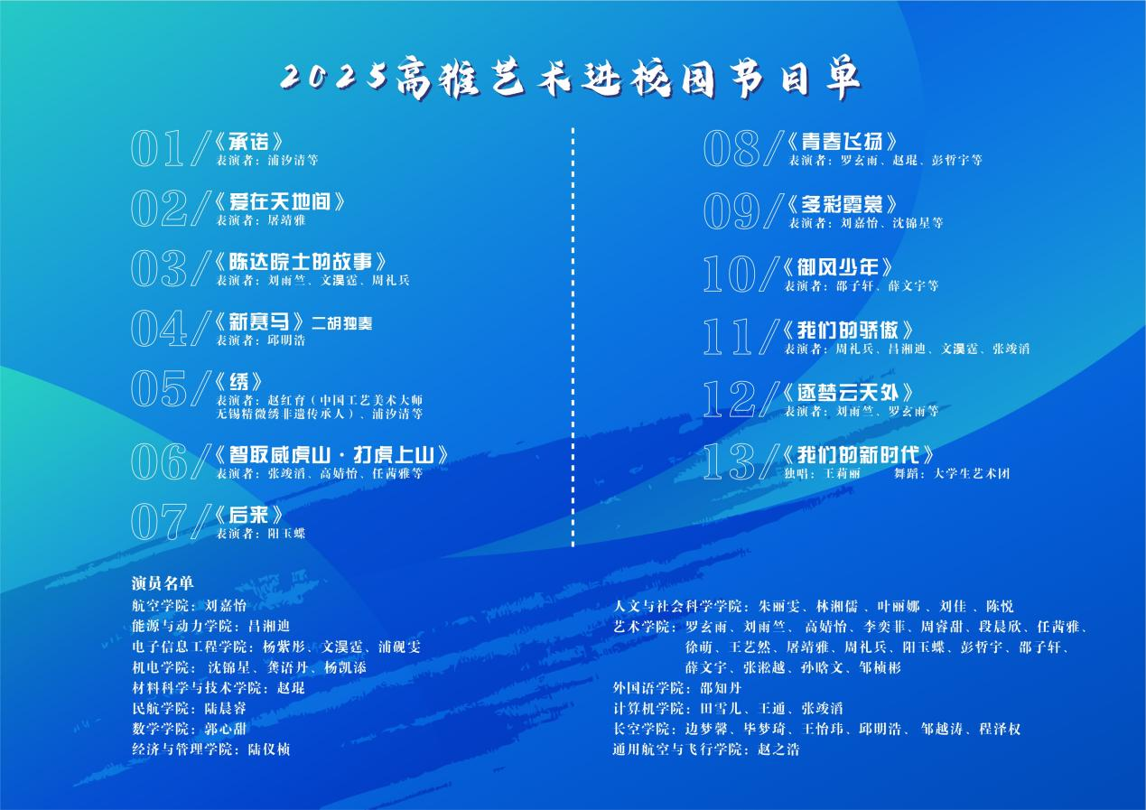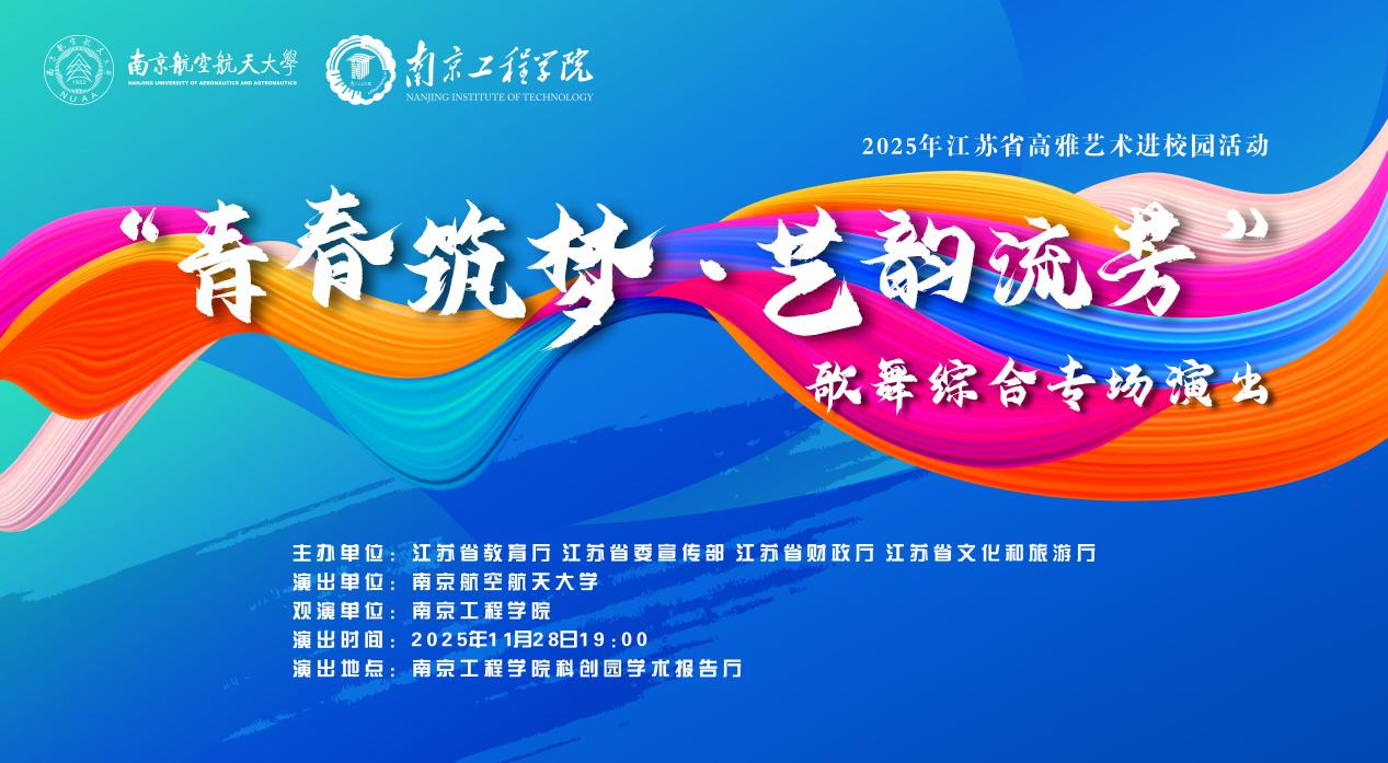 为深入学习贯彻党的二十大精神,落实《关于全面实施学校美育浸润行动的通知》、《关于全面加强和改进新时代学校美育工作的意见》等文件要求,切实发挥文化育人重要作用,校团委联合南京航空航天大学大学生艺术团在学校开展高雅艺术进校园活动。现将活动通知如下: