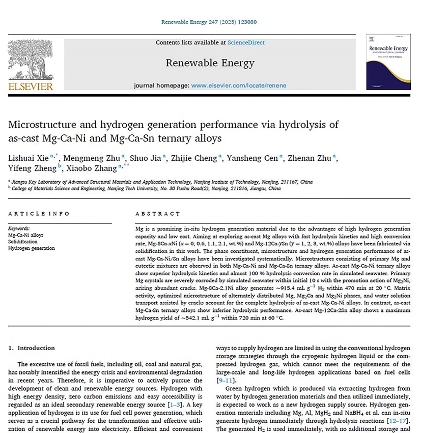 近日,我校材料科学与工程学院解立帅博士以第一作者及通讯作者、章晓波教授为共同通讯作者,南京工程学院为第一署名单位,联合南京工业大学郑益锋教授,在国际权威期刊《Renewable Energy》上发表了学术论文:“Microstructure and hydrogen generation performance via hydrolysis of as-cast Mg-Ca-Ni and Mg-Ca-Sn ternary alloys”。该期刊是中科院工程技术一区TOP期刊,影响因子9.1。