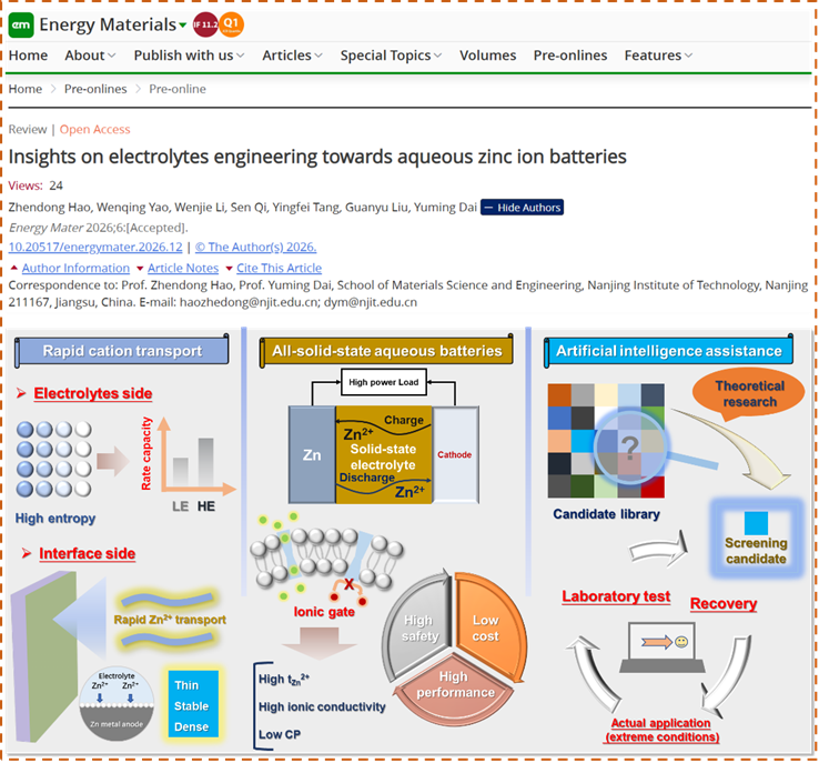在电池的结构中,基于纳米多孔材料的功能性隔膜调控离子传输过程具有一定的局限,因此,更加深入地通过电解质工程策略来剖析整个充放电过程中的离子传输过程具有重要的实际意义。基于此,郝振东博士以第一作者及通讯作者,戴玉明副教授为共同通讯作者,南京工程学院为唯一署名单位,在能源材料领域国际知名期刊《Energy Materials》上发表了题为“Insights on Electrolytes Engineering towards Aqueous Zinc Ion Batteries”的学术论文。《Energy Materials》是能源材料领域极具影响力的一区期刊,聚焦于纳米科学、能源化学、材料工程等前沿领域,影响因子为11.2。
