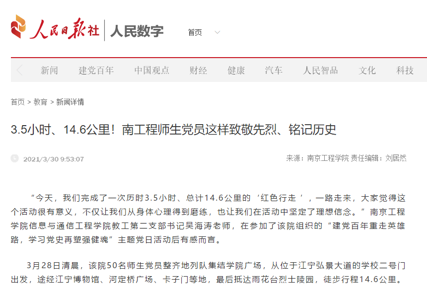 “今天,我们完成了一次历时3.5小时、总计14.6公里的‘红色行走 ’, 一路走来,大家觉得这个活动很有意义,不仅让我们从身体心理得到磨练,也让我们在活动中坚定了理想信念。”南京工程学院信息与通信工程学院教工第二支部书记吴海涛老师,在参加了该院组织的“建党百年重走英雄路,学习党史再塑强健魂”主题党日活动后有感而言。