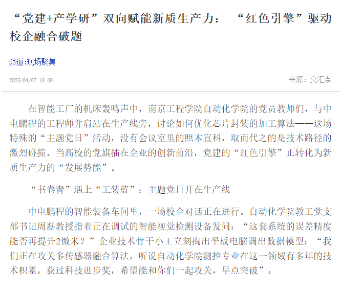 在智能工厂的机床轰鸣声中,南京工程学院自动化学院的党员教师们,与中电鹏程的工程师并肩站在生产线旁,讨论如何优化芯片封装的加工算法——这场特殊的“主题党日”活动,没有会议室里的照本宣科,取而代之的是技术路径的激烈碰撞。当高校的党旗插在企业的创新前沿,党建的“红色引擎”正转化为新质生产力的“发展势能”。