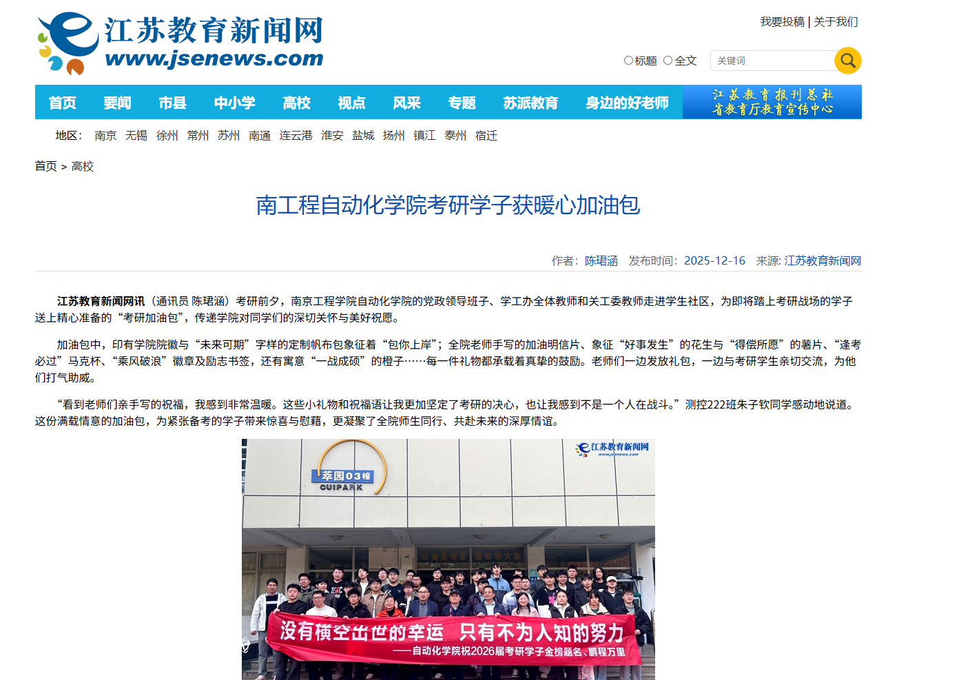 江苏教育新闻网讯(通讯员陈珺涵)考研前夕,南京工程学院自动化学院的党政领导班子、学工办全体教师和关工委教师走进学生社区,为即将踏上考研战场的学子送上精心准备的“考研加油包”,传递学院对同学们的深切关怀与美好祝愿。