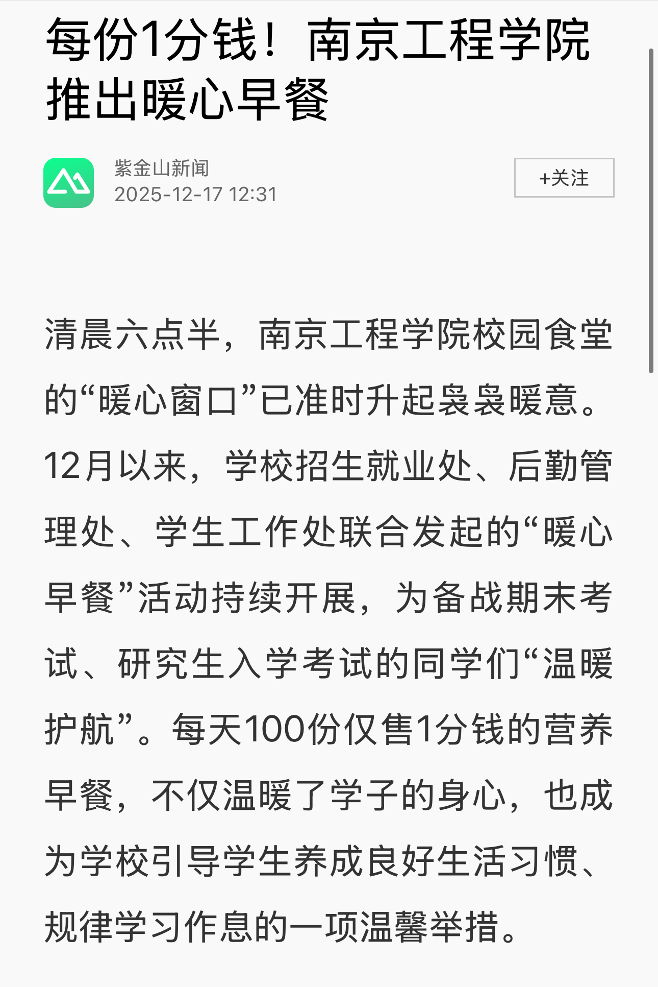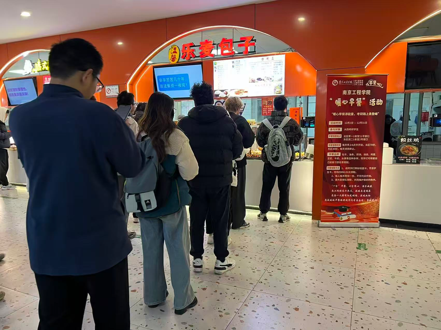 清晨六点半,南京工程学院校园食堂的“暖心窗口”已准时升起袅袅暖意。12月以来,学校招生就业处、后勤管理处、学生工作处联合发起的“暖心早餐”活动持续开展,为备战期末考试、研究生入学考试的同学们“温暖护航”。每天100份仅售1分钱的营养早餐,不仅温暖了学子的身心,也成为学校引导学生养成良好生活习惯、规律学习作息的一项温馨举措。