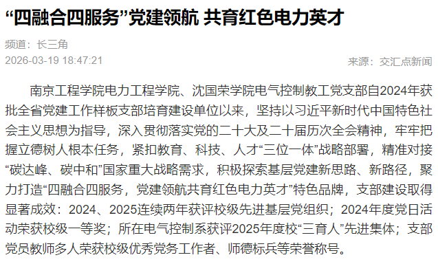 南京工程学院电力工程学院、沈国荣学院电气控制教工党支部自2024年获批全省党建工作样板支部培育建设单位以来,坚持以习近平新时代中国特色社会主义思想为指导,深入贯彻落实党的二十大及二十届历次全会精神,牢牢把握立德树人根本任务,紧扣教育、科技、人才“三位一体”战略部署,精准对接“碳达峰、碳中和”国家重大战略需求,积极探索基层党建新思路、新路径,聚力打造“四融合四服务,党建领航共育红色电力英才”特色品牌,支部建设取得显著成效:2024、2025连续两年获评校级先进基层党组织;2024年度党日活动荣获校级一等奖;所在电气控制系获评2025年度校“三育人”先进集体;支部党员教师多人荣获校级优秀党务工作者、师德标兵等荣誉称号。