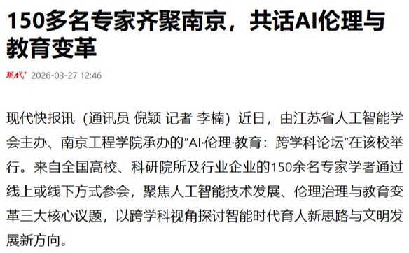 现代快报讯(通讯员 倪颖 记者 李楠)近日,由江苏省人工智能学会主办、南京工程学院承办的“AI·伦理·教育:跨学科论坛”在该校举行。来自全国高校、科研院所及行业企业的150余名专家学者通过线上或线下方式参会,聚焦人工智能技术发展、伦理治理与教育变革三大核心议题,以跨学科视角探讨智能时代育人新思路与文明发展新方向。
