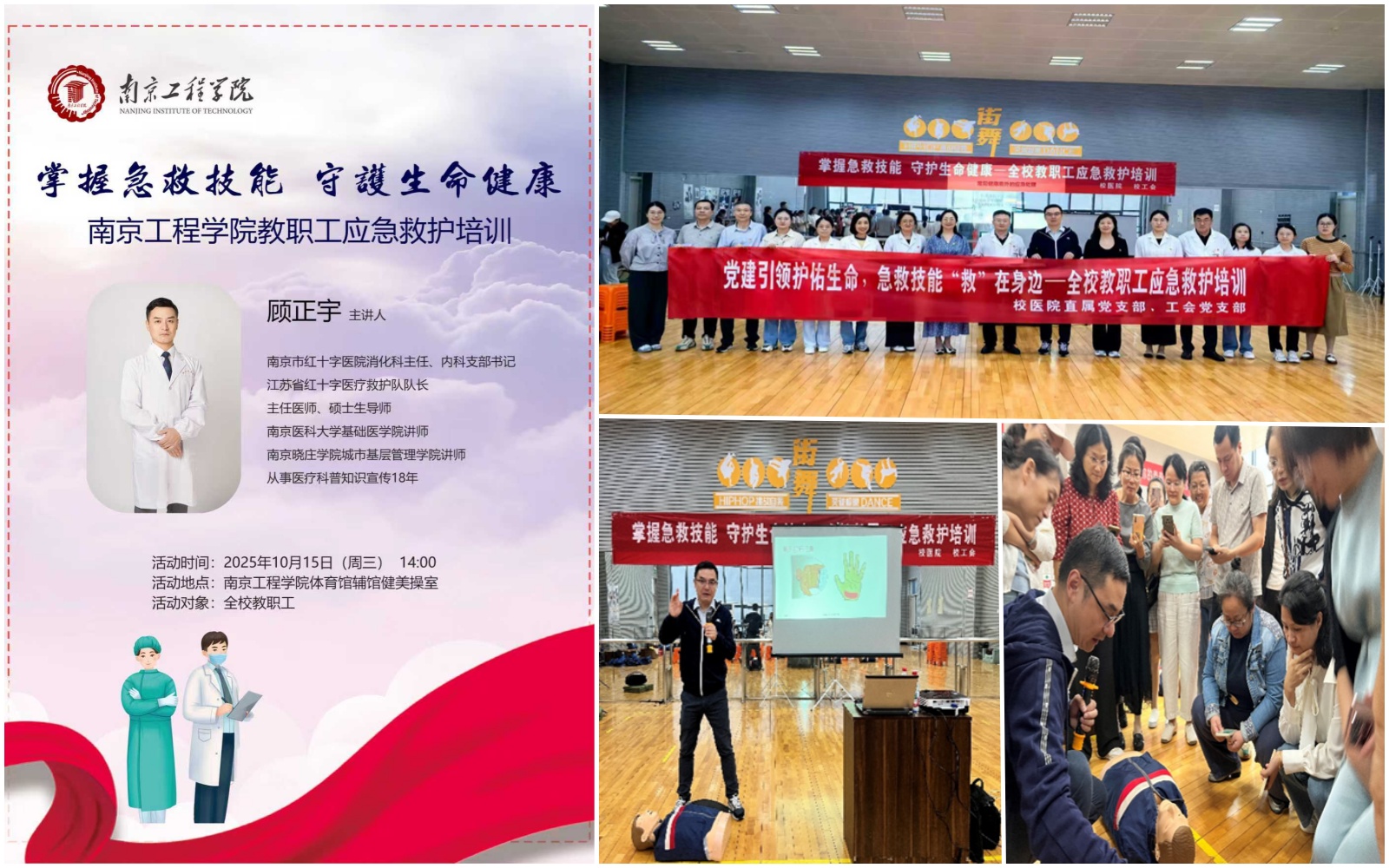聚焦应急救护,筑牢校园安全防护网。同日开展的“掌握急救技能,守护生命健康”应急救护培训,由江苏省红十字会救护队总队长、南京市红十字医院消化科主任顾正宇主任医师担任主讲。顾正宇围绕心肺复苏(CPR)、体外自动除颤仪(AED)使用、食物中毒处置、烫伤急救等核心技能,结合案例进行深入浅出的讲解。在实操环节,约50名参训教职工在专家与校医院医护人员指导下,分组利用模拟设备练习了胸外按压等操作。大家认为培训内容实用,有效提升了自救互救能力。