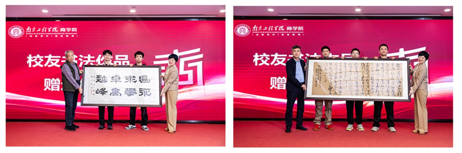 张文莉在表态发言中表示,将努力把校友会建设成为校友情感的“温暖港湾”、协同发展的“同行航船”和精神传承的“不息火炬”,真正与校友同心、同向、同行。老教师代表李秀真现场分享执教感悟,一句“南工程需要你们、商学院需要你们、我需要你们……”让全场为之动容。学院老领导洪志钧、财8511班校友何国友两位老师特意为校友会成立创作了书法作品,将现场氛围推向高潮。